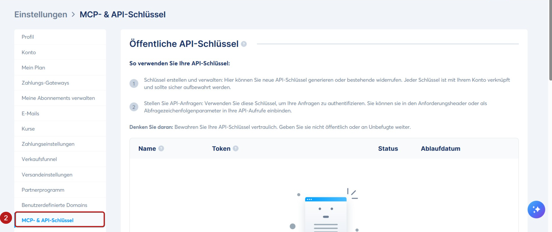 Klicken Sie im linken Menü auf MCP & API-Keys (2).