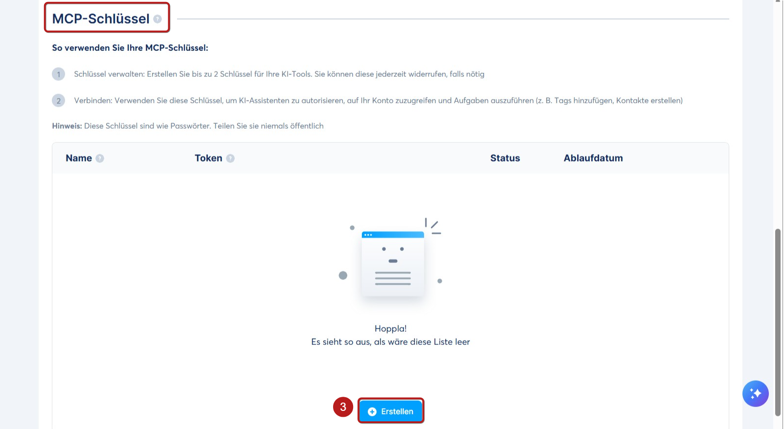 Scrollen Sie nach unten zum Abschnitt MCP-Keys und klicken Sie auf Erstellen (3).