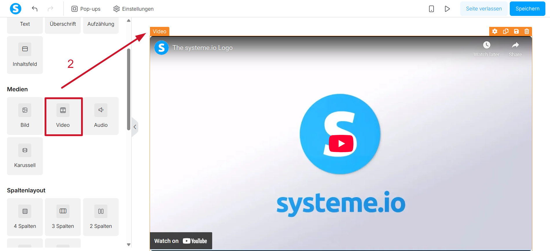 1.2 Innerhalb des Editors scrollen Sie auf der linken Seite nach unten, bis Sie die Option „Video“ finden. Ziehen Sie dieses Element auf die Seite an die Stelle, an der Ihr Video angezeigt werden soll ( 2).