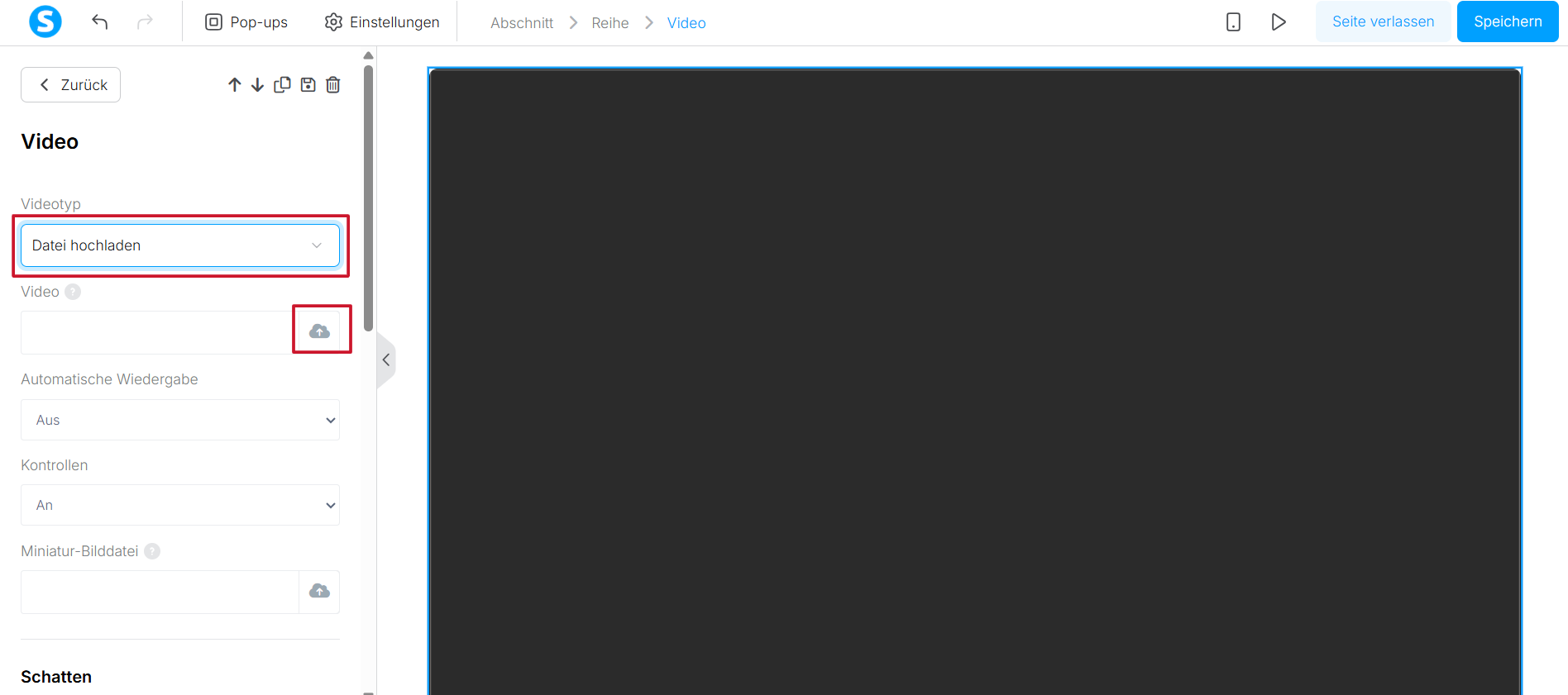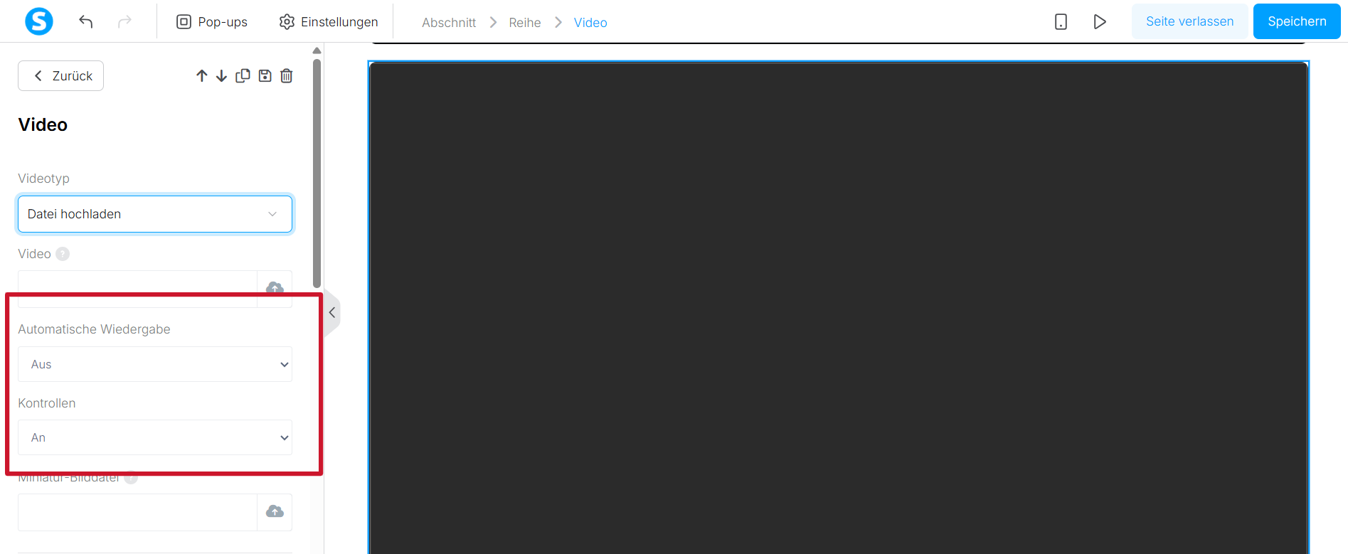 1.7 Passen Sie unbedingt Ihre Video-Einstellungen an, um die gewünschten Ergebnisse zu erzielen. Sie können Autoplay und Steuerung ein- oder ausschalten, ein benutzerdefiniertes Thumbnail hochladen und viele weitere Einstellungen vornehmen.