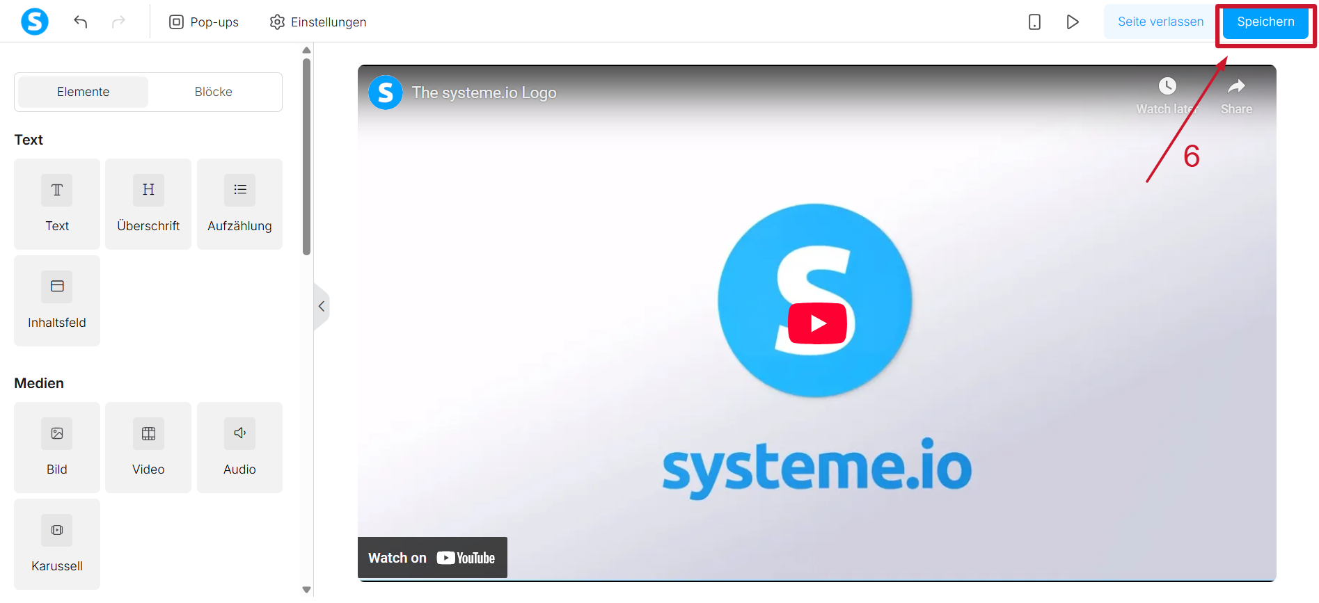 1.6 Fertig! Ihr Video ist nun auf Ihrer Seite hochgeladen und wird bei systeme.io gehostet. Klicken Sie auf die Schaltfläche „Speichern“, um Ihre Änderungen zu sichern ( 6).