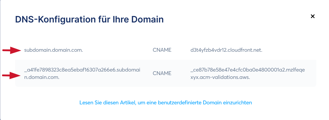 1.3 Sobald die Subdomain hinzugefügt und gespeichert wurde, erscheint ein neues Pop-up. Sie sehen zwei Wertezeilen, die wir CNAME nennen. Diese CNAMEs sind die DNS-Einträge, die Sie zu Ihrer Hosting-Plattform hinzufügen, um Ihre Subdomain in systeme.io zu integrieren.