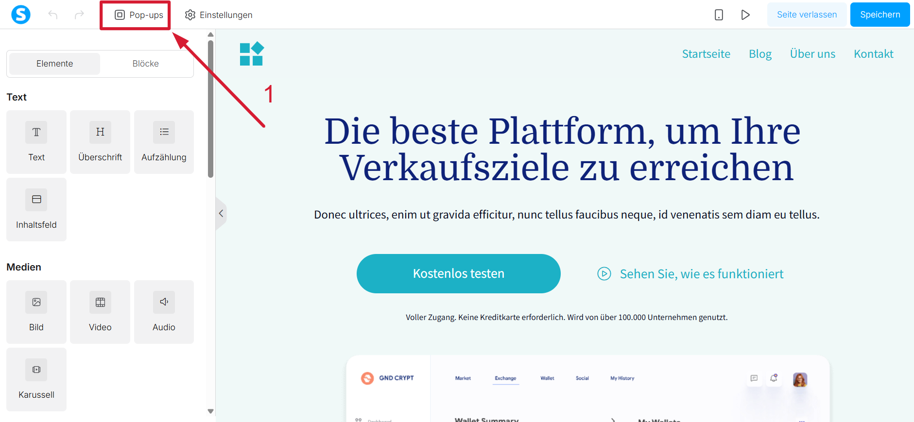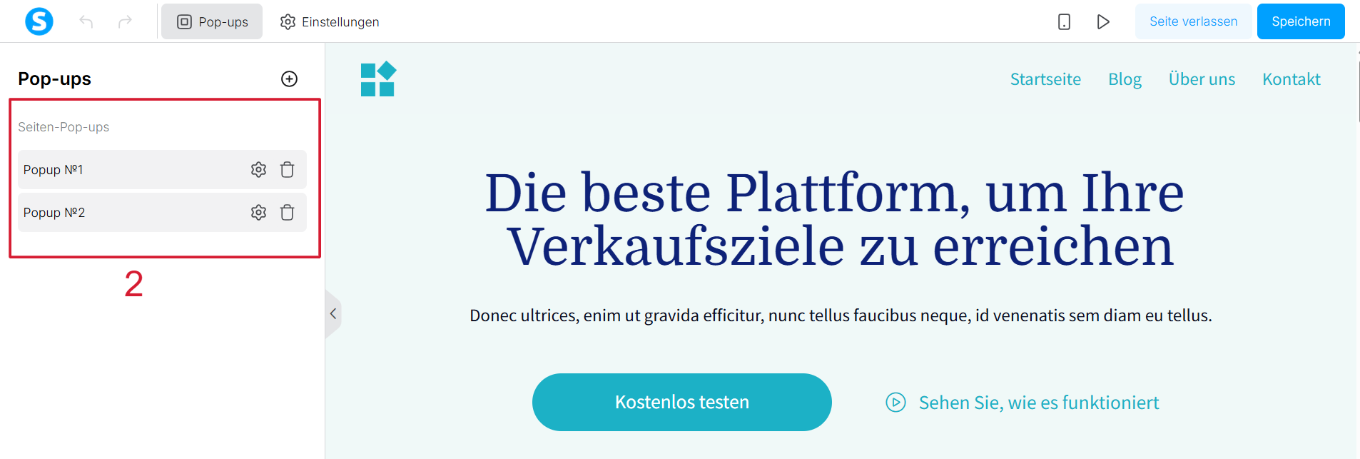 Klicken Sie in Ihrem Seiten-Editor auf die Schaltfläche „Pop-ups“, die sich oben links auf der Seite befindet (1).