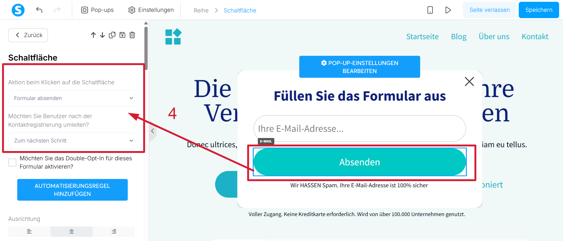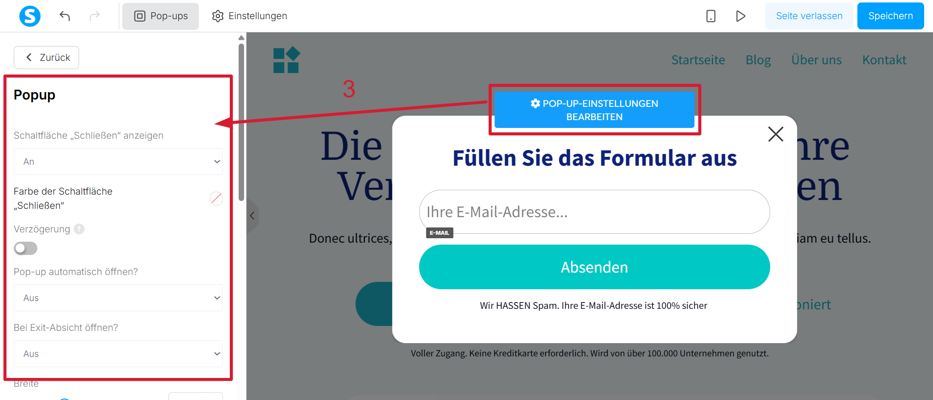 Um die Pop-Up-Optionen anzuzeigen, klicken Sie auf „Pop-Up-Einstellungen bearbeiten“, das sich über dem Pop-Up-Formular befindet (3).
