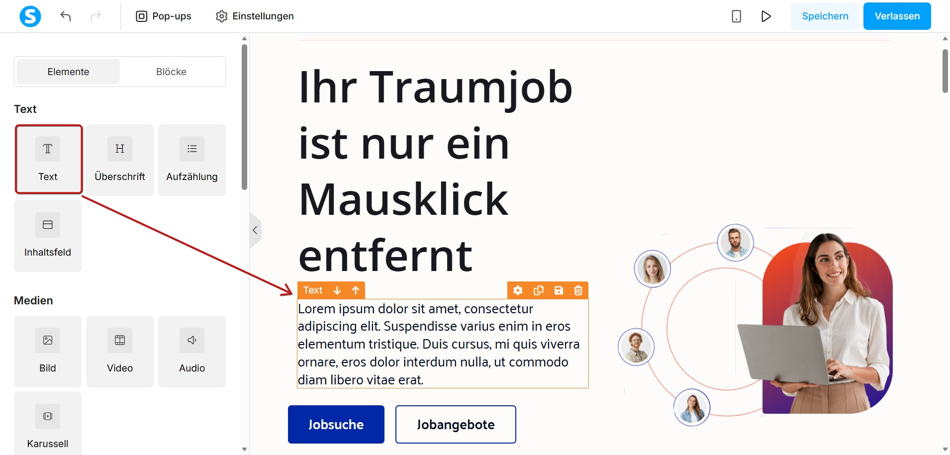 So verwenden Sie den Text-Abschnitt im Editor