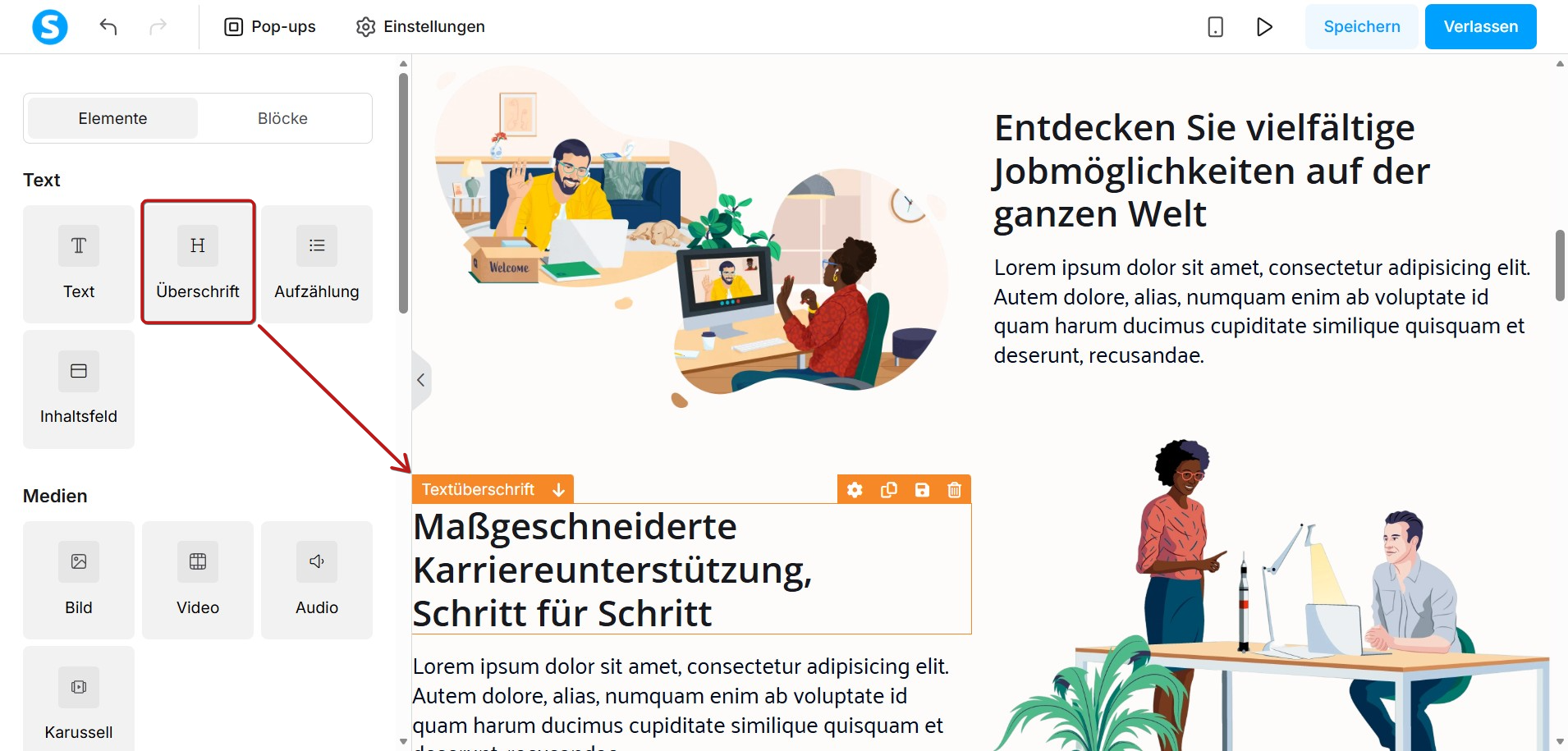 Um eine Überschrift hinzuzufügen, ziehen Sie das Element Überschrift auf Ihre Seite.