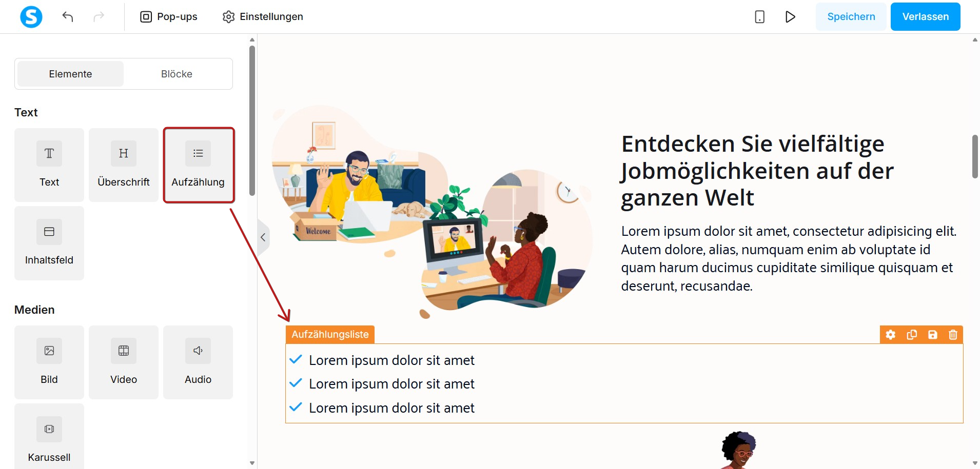 Um eine Aufzählungsliste hinzuzufügen, klicken Sie auf das Element Aufzählungsliste und ziehen Sie es auf Ihre Seite.