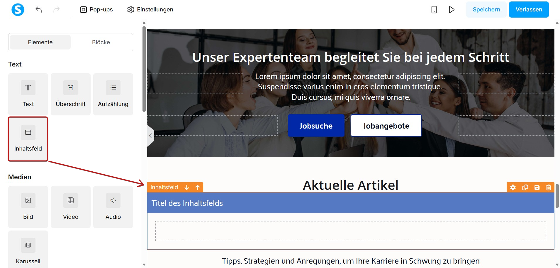 Ein Inhaltsfeld kann verwendet werden, um verschiedene Inhaltselemente zusammenzufassen. Um ein Inhaltsfeld hinzuzufügen, ziehen Sie das Element Inhaltsfeld und legen Sie es auf Ihrer Seite ab.