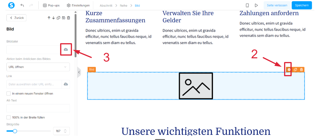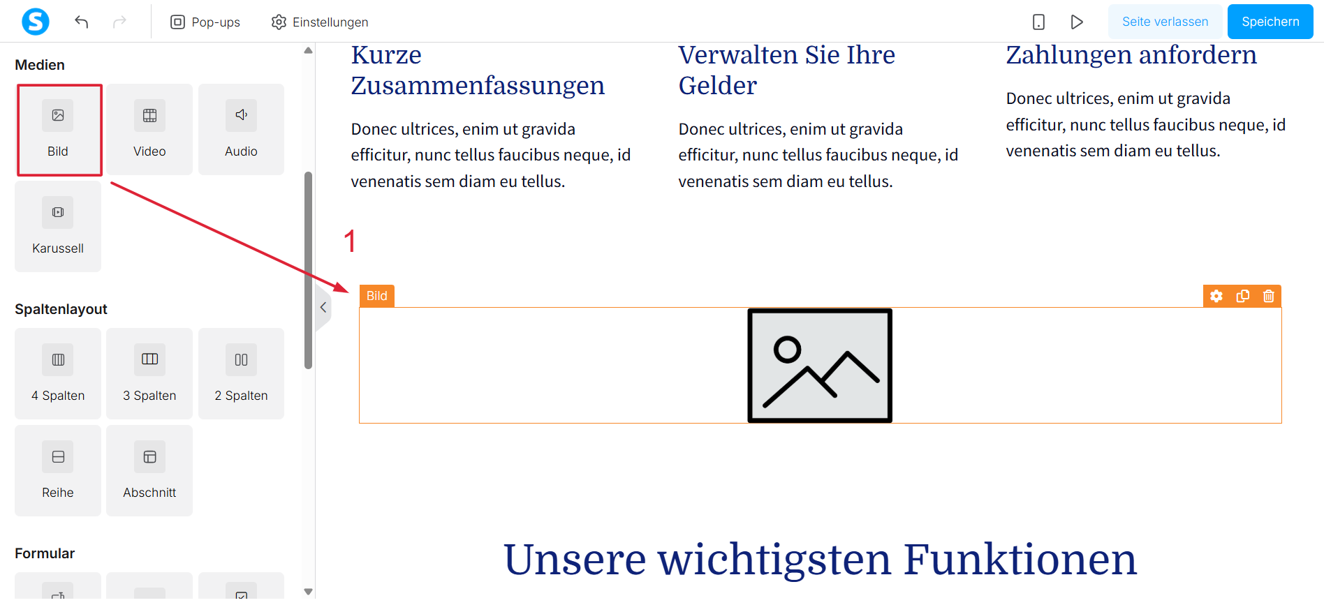 Ziehen Sie im Seiten-Editor das Element „Bild“ aus dem linken Bedienfeld und legen Sie es auf Ihrer Seite ab (1).