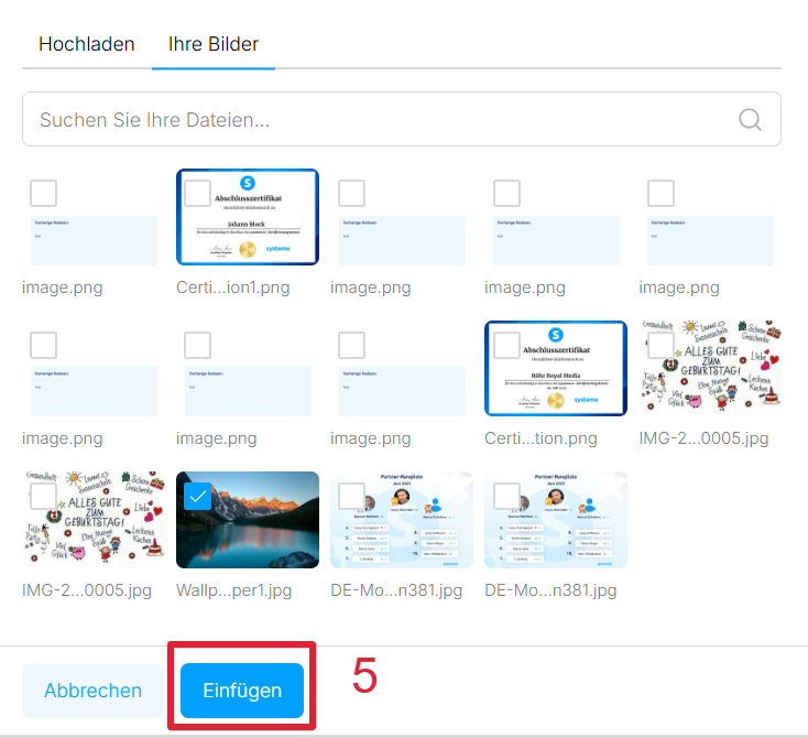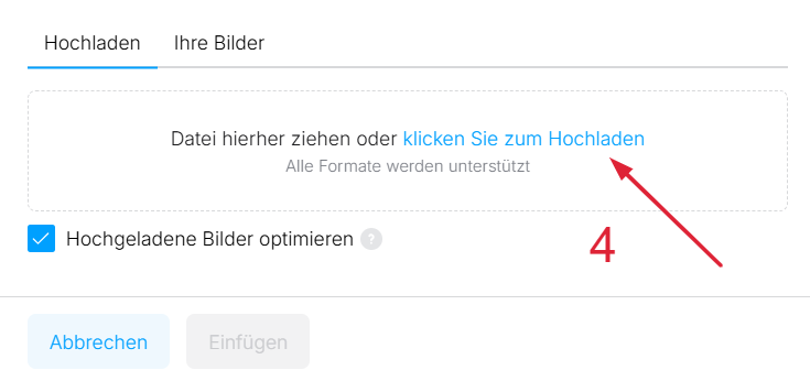 Laden Sie das Bild auf Ihre Seite hoch, indem Sie auf "Einfügen" klicken (5).