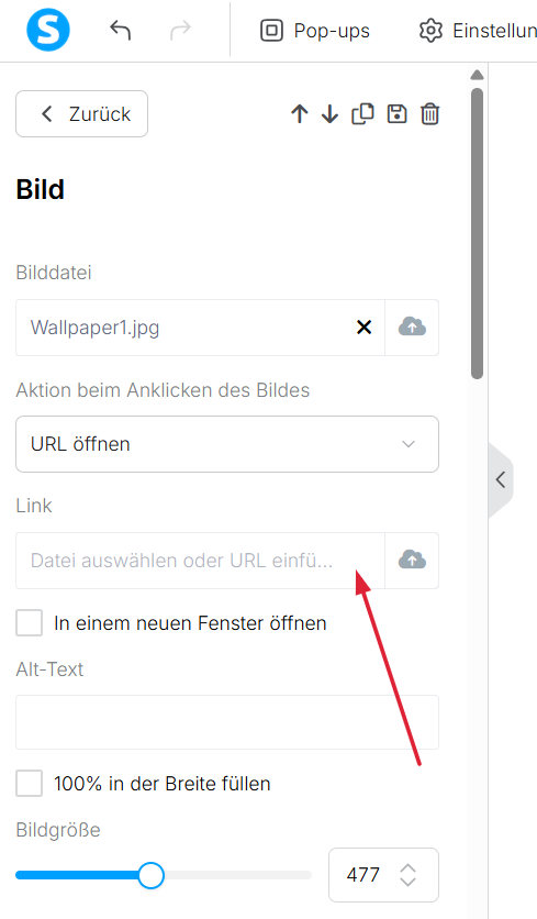 Klicken Sie auf das Bild, um die Eigenschaften des Bildelements im linken Bedienfeld anzuzeigen. Wählen Sie im Feld „Link“ eine Datei zum Herunterladen aus oder fügen Sie eine URL ein.