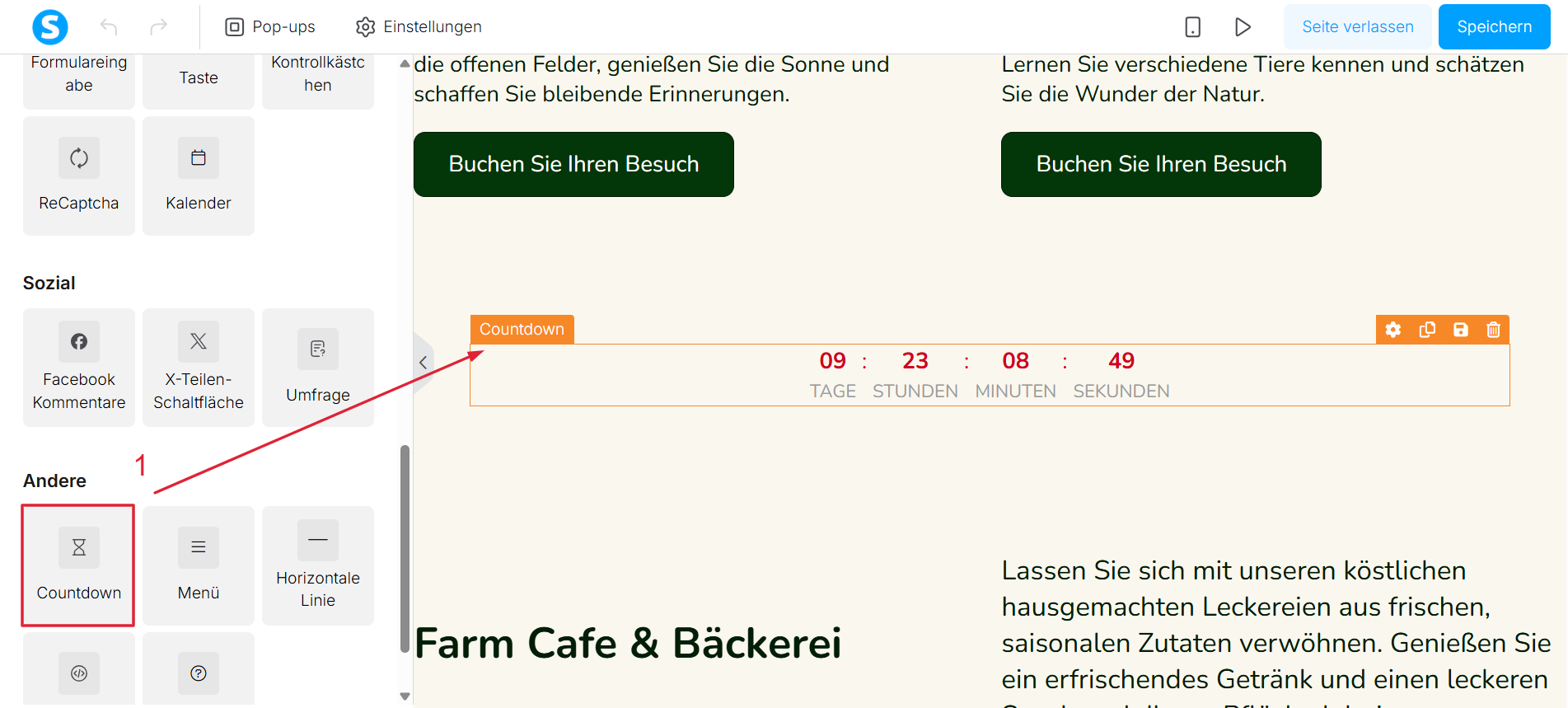 Ziehen Sie im Seiteneditor das Element „Countdown“ aus dem linken Panel und legen Sie es auf Ihrer Seite ab (1).