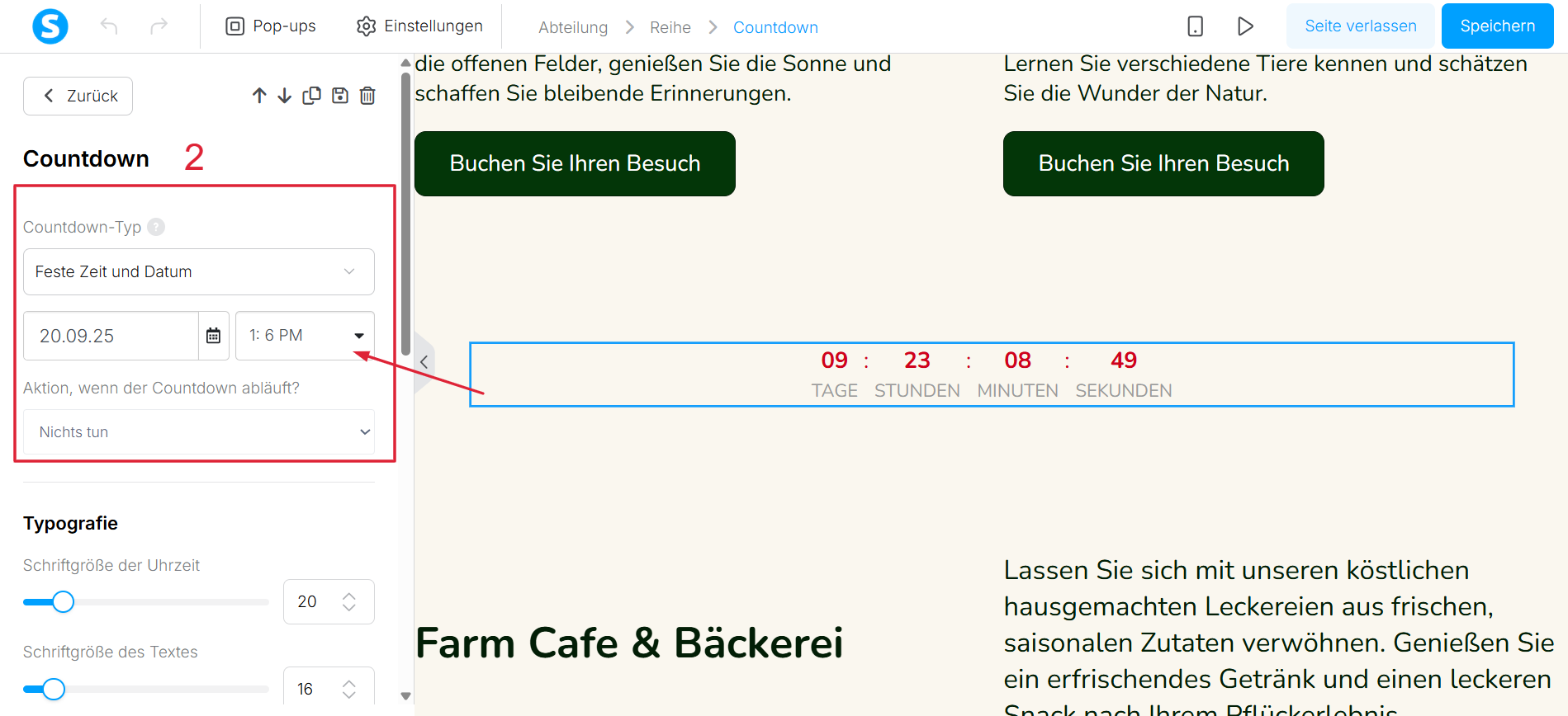 Klicken Sie auf den Countdown-Timer, um seine Eigenschaften im linken Panel anzuzeigen. Wählen Sie im Auswahlfeld „Countdown-Typ“ die Option „Feste Uhrzeit und festes Datum“ (2).