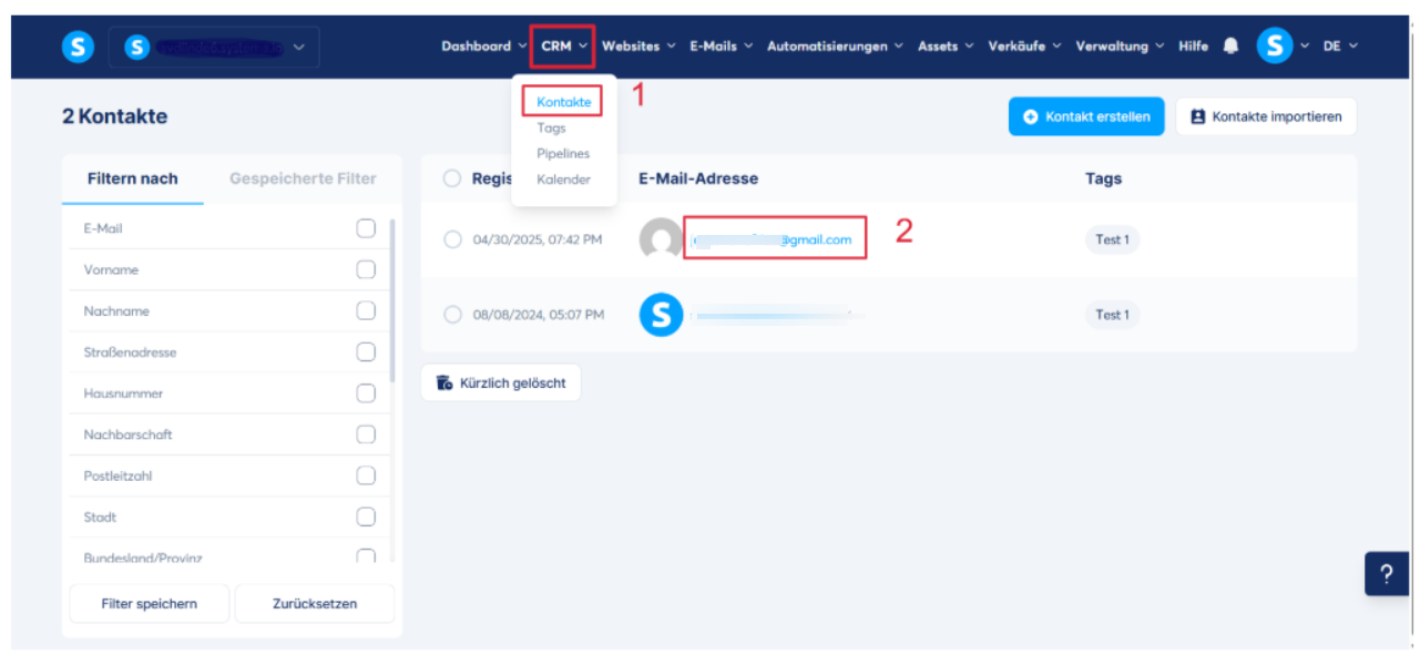 Gehen Sie zu „Kontakte“ unter „CRM“ (1) und klicken Sie anschließend auf einen Ihrer Kontakte aus der Liste (2).