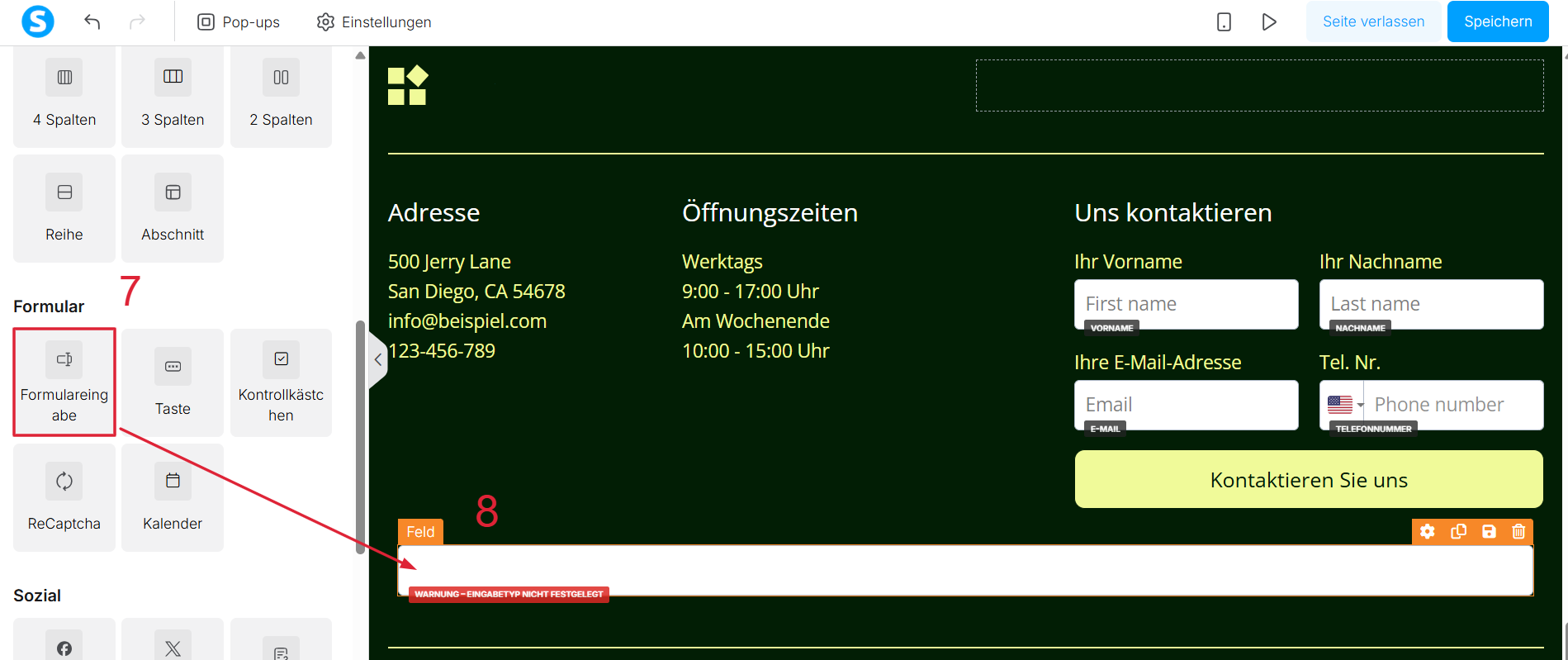 Um das neu erstellte benutzerdefinierte Feld zu einem Formular hinzuzufügen, öffnen Sie den Seiteneditor, ziehen Sie das „Formularfeld“-Element (7) auf die Seite und wählen Sie anschließend seine Parameter aus (8).