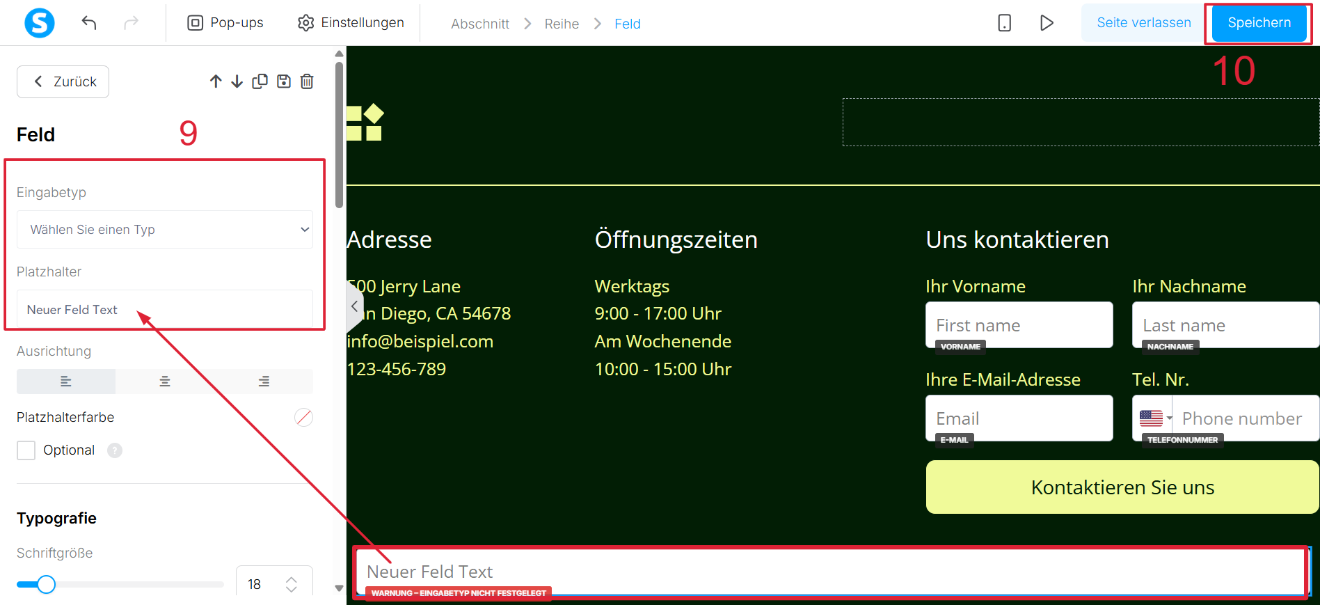 Klicken Sie auf das Feld, um dessen Optionen auf der linken Seite der Seite anzuzeigen. Wählen Sie bei der Option „Eingabetyp“ den Datentyp aus, den Sie beim Erstellen Ihres benutzerdefinierten Formularfelds angegeben haben (9).