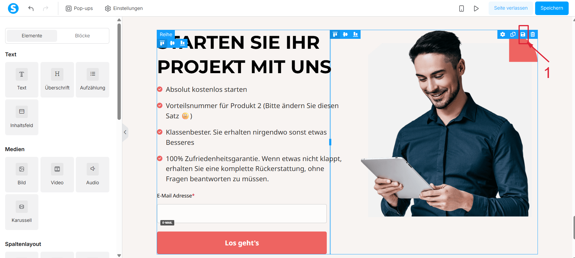 Platzieren Sie den Mauszeiger auf dem Block, den Sie speichern möchten, und klicken Sie auf das Diskettensymbol, um den Block zu speichern (1).