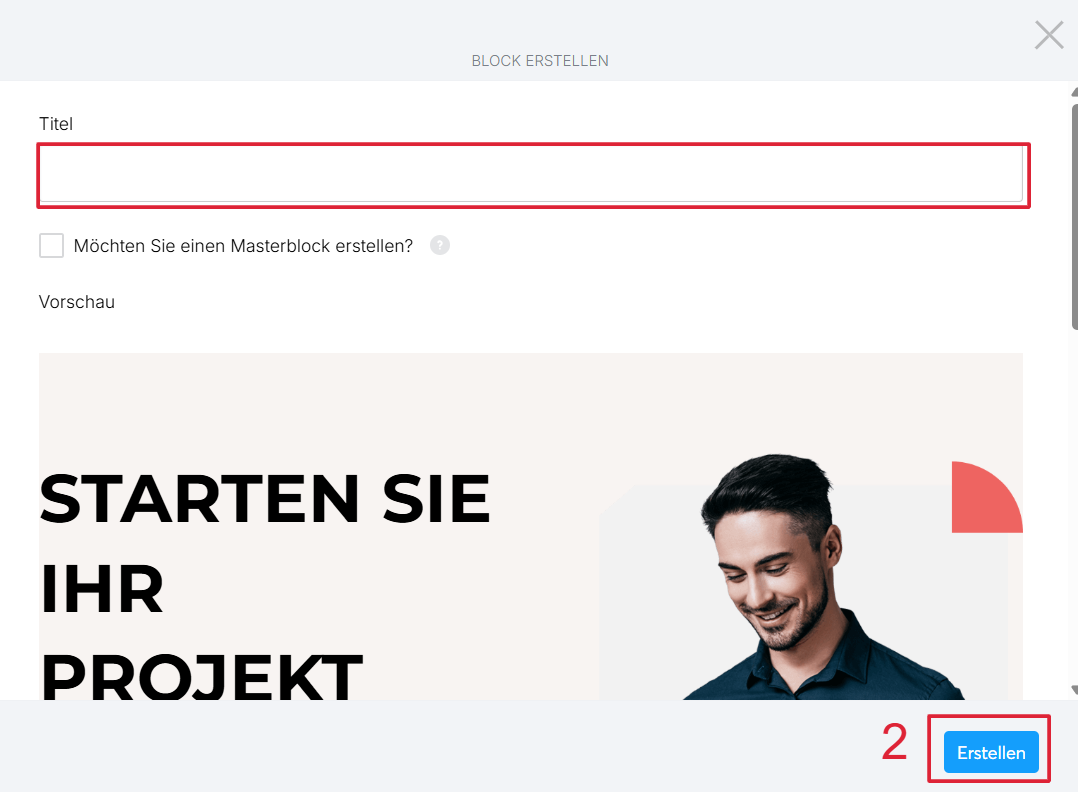 Benennen Sie den Block, damit Sie ihn leicht wiederfinden können, und klicken Sie auf „Erstellen“ (2).