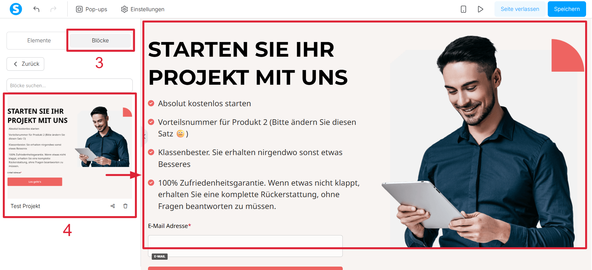 Ein Block ist eine Gruppierung von Elementen und Inhalten, die gespeichert und auf anderen Seiten wiederverwendet werden kann.