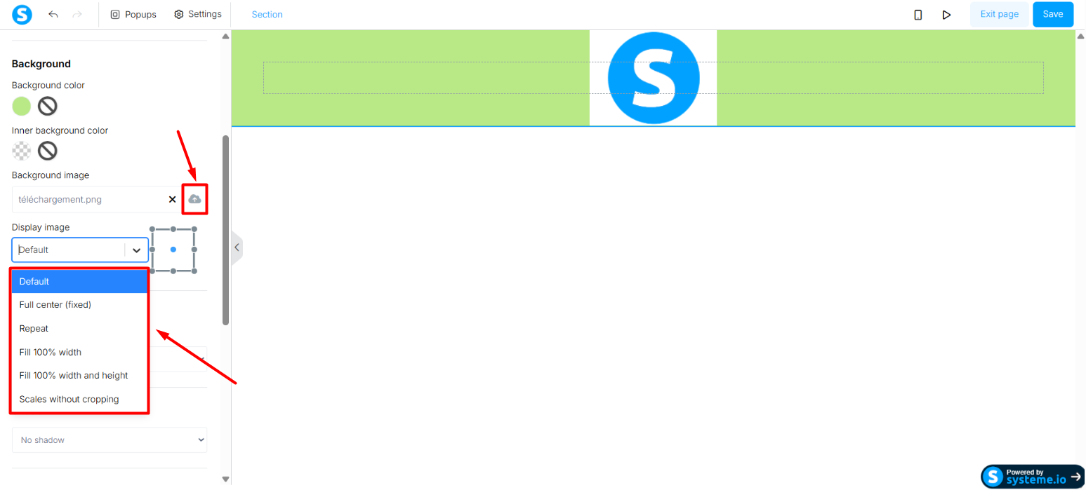 - ein Hintergrundbild hochladen, indem Sie auf das Cloud-Symbol klicken. Außerdem haben Sie die Möglichkeit, den Anzeigemodus des Bildes auszuwählen.
