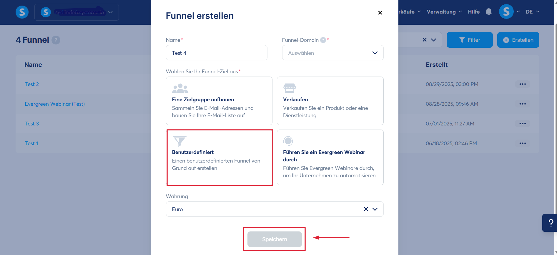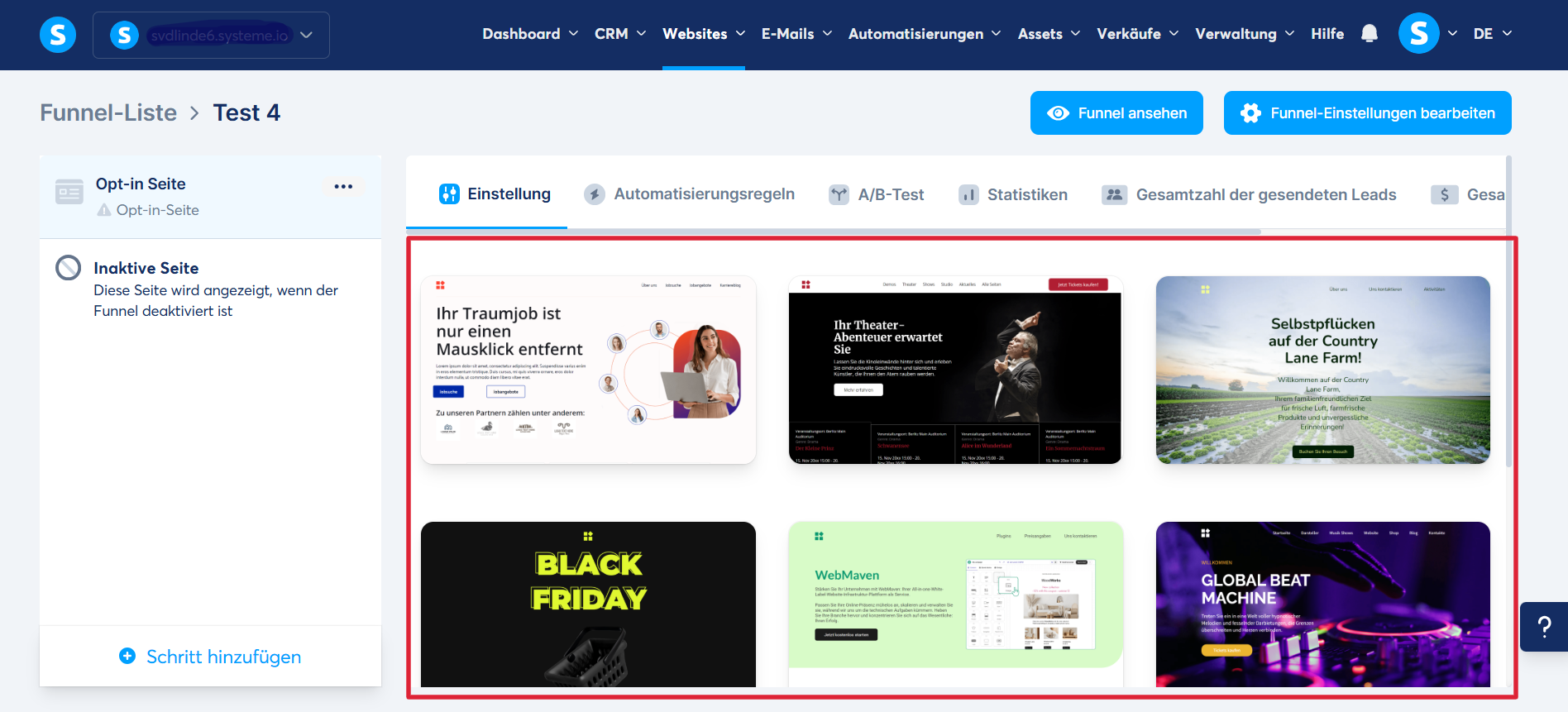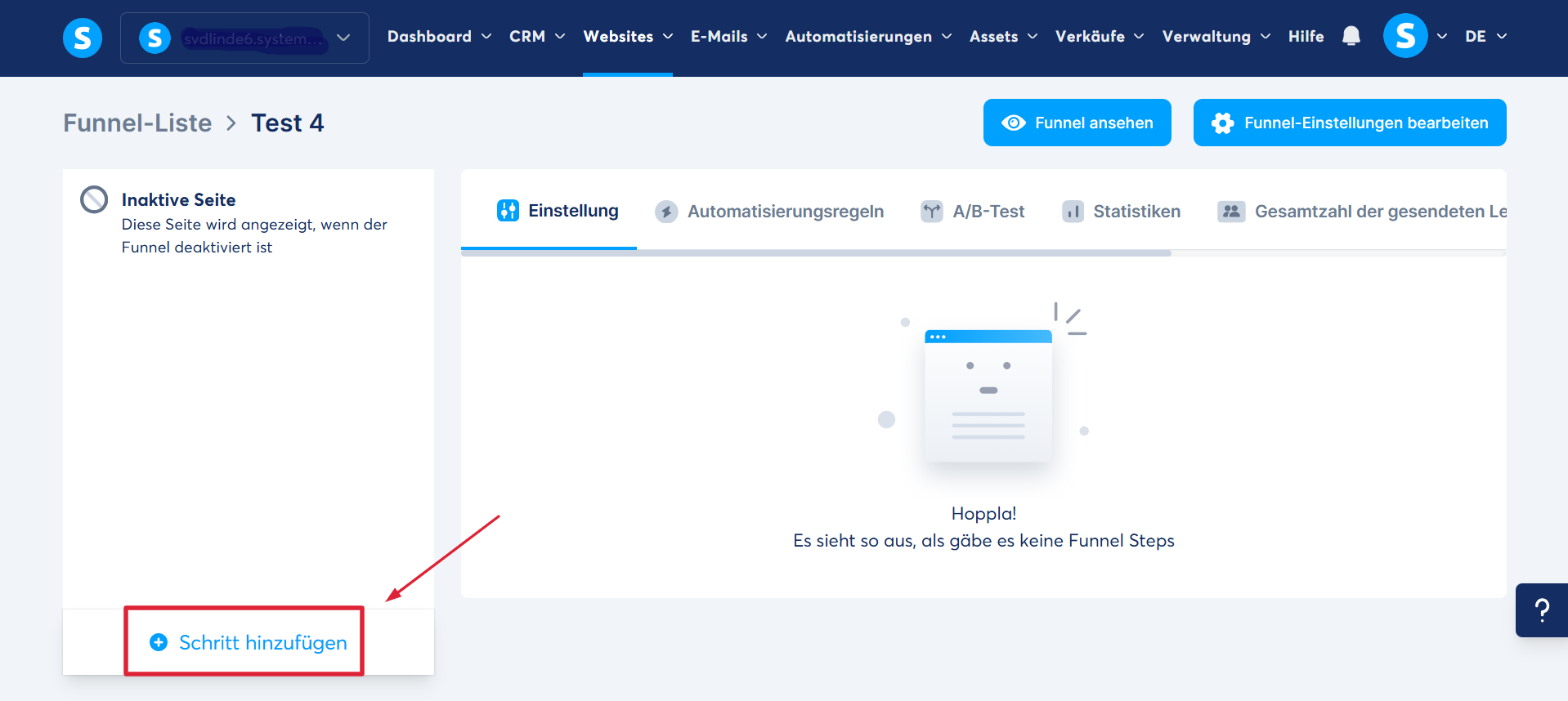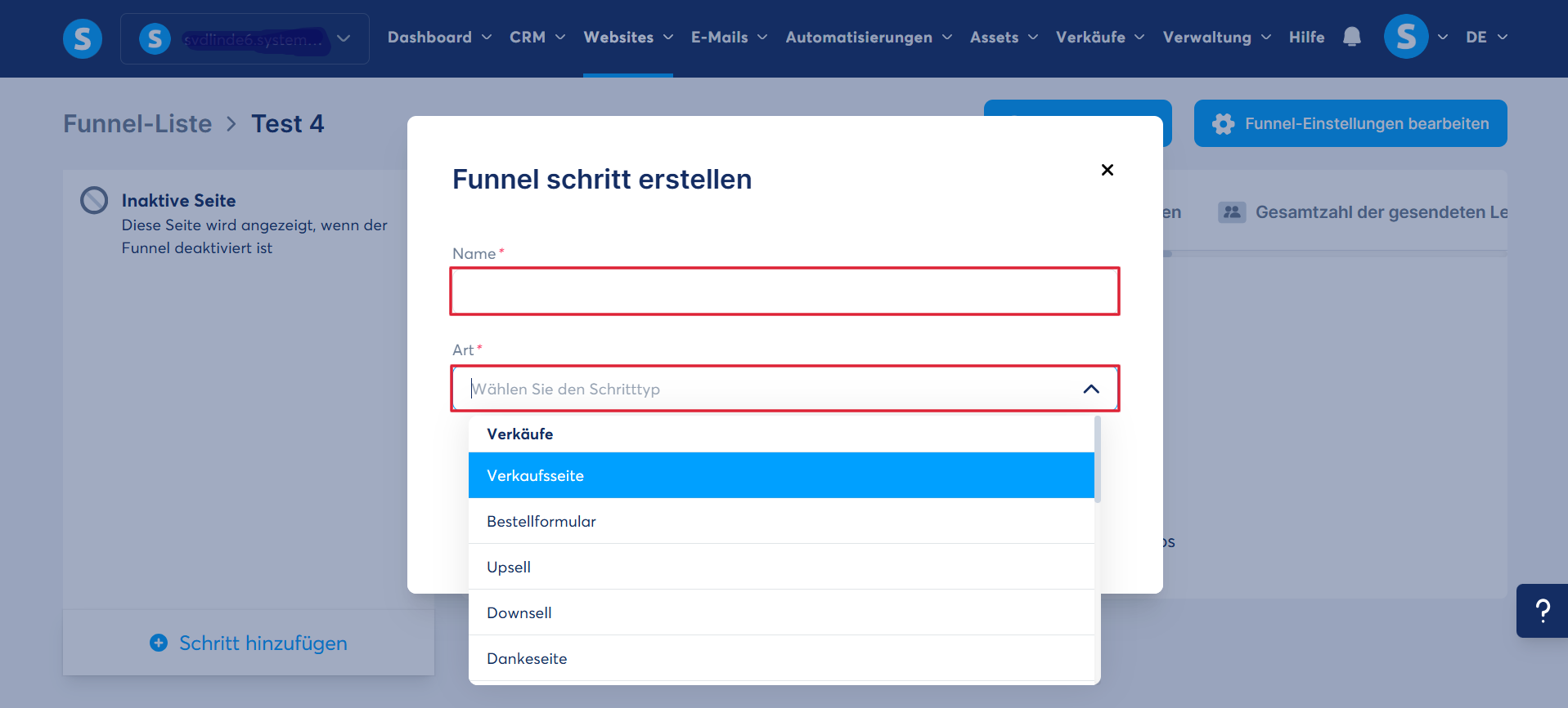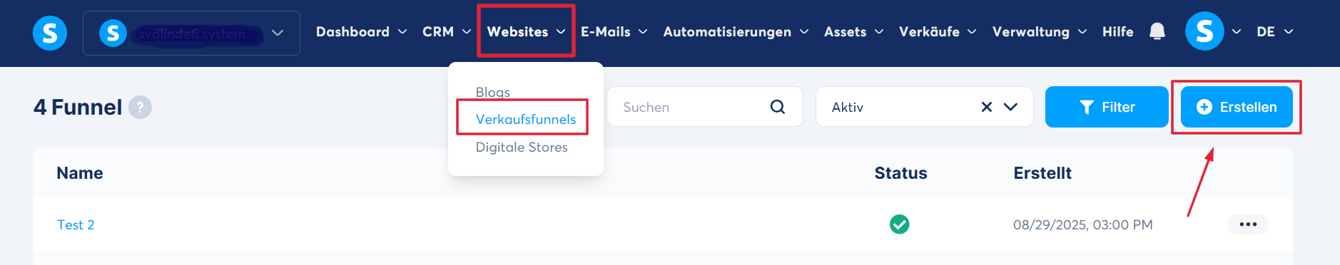 Gehen Sie zum Reiter „Websites“, darunter finden Sie die Option "Verkaufsfunnels" und klicken Sie auf „Erstellen“, um einen neuen Verkaufsfunnel einzurichten.
