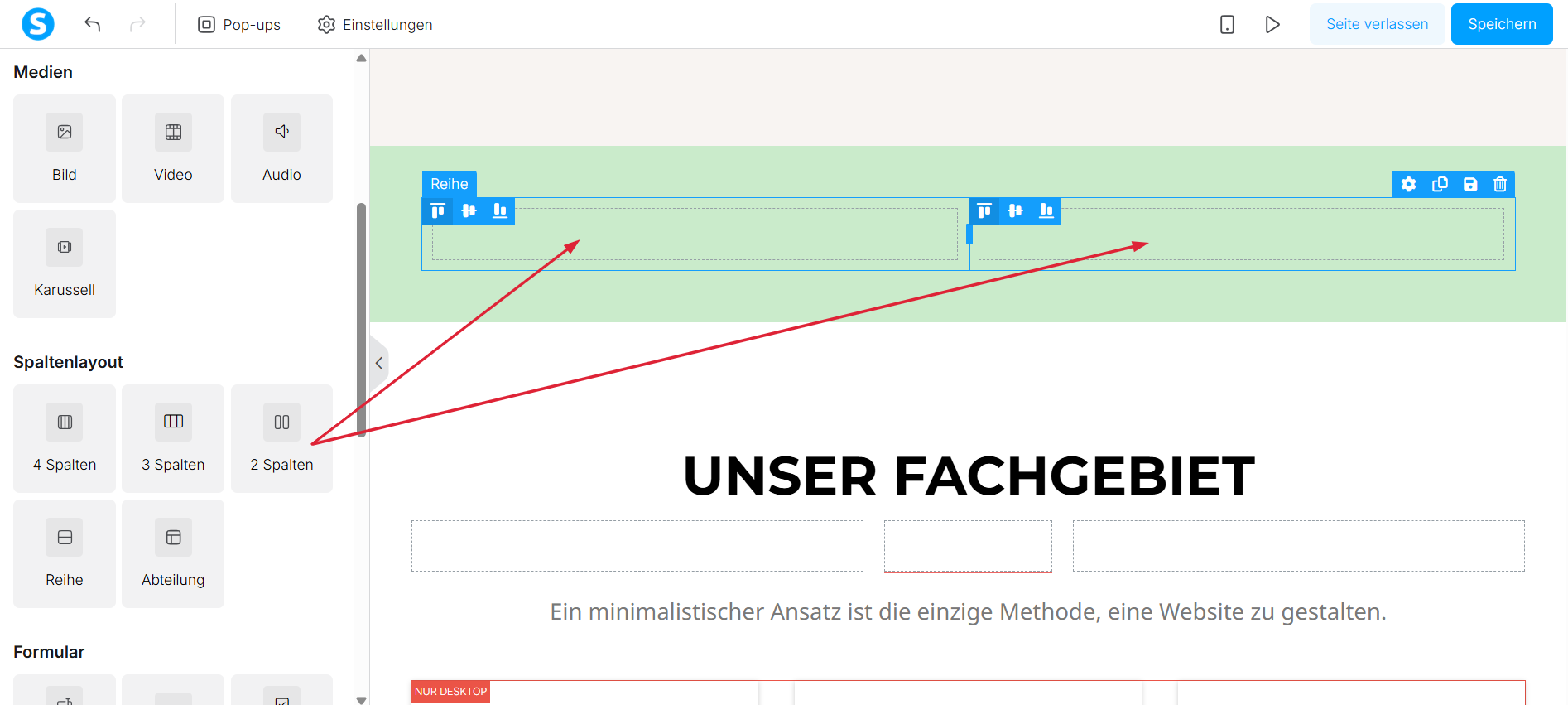 Fügen Sie Spalten hinzu, indem Sie das „Spalte“-Element in die Abschnitte ziehen.