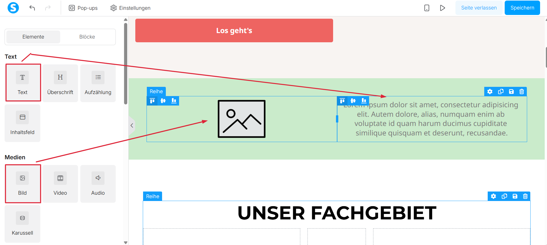 Sie können so viele Elemente hinzufügen, wie Sie möchten, indem Sie das gewünschte Element in den Seiteneditor ziehen.
