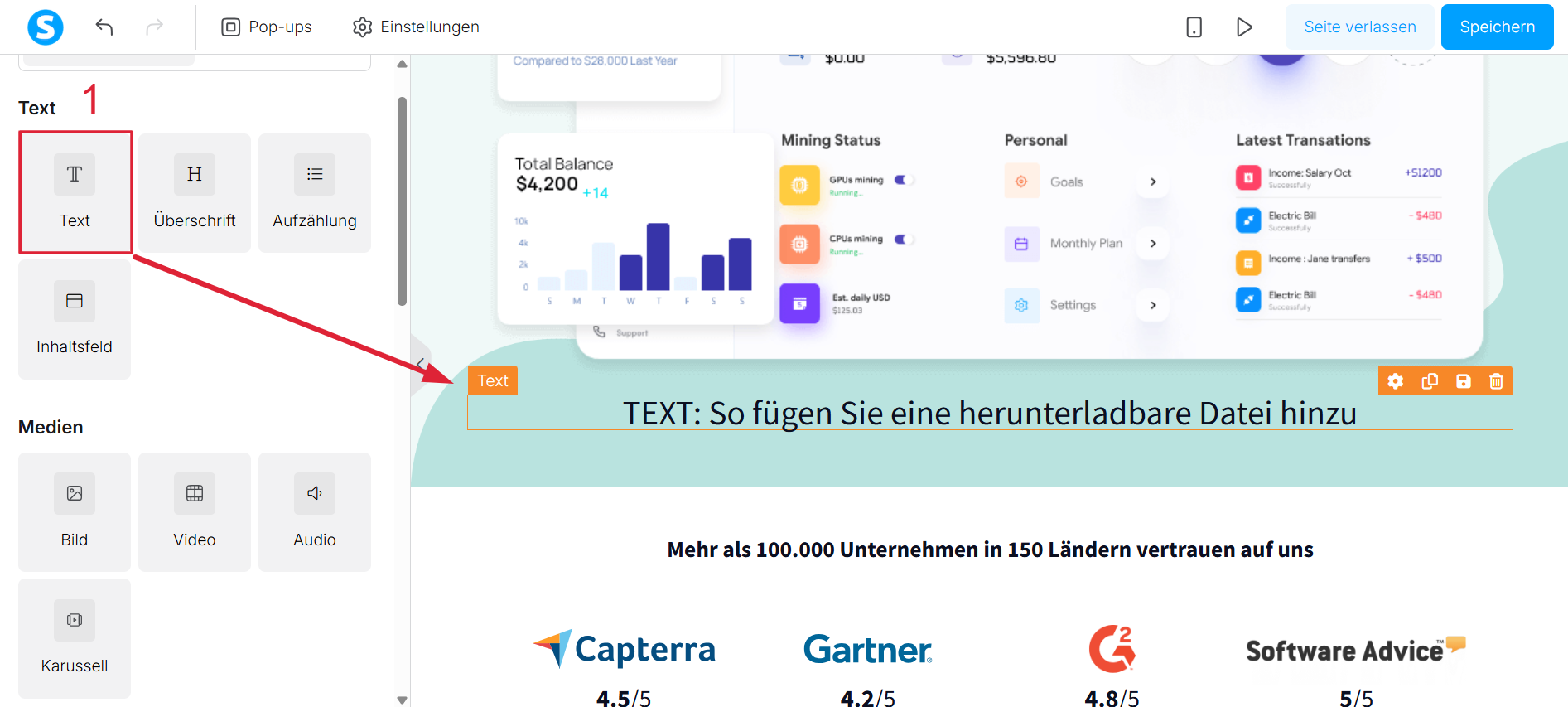 Ziehen Sie im Seiteneditor das Text-Element (1) aus dem linken Panel und legen Sie es auf Ihrer Seite ab.