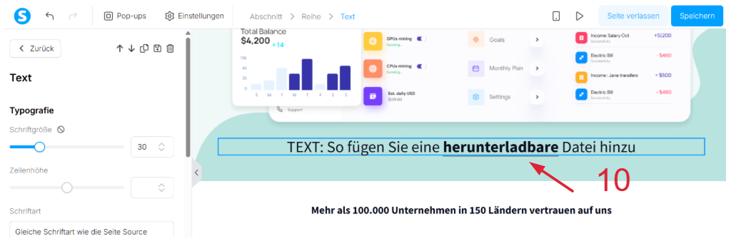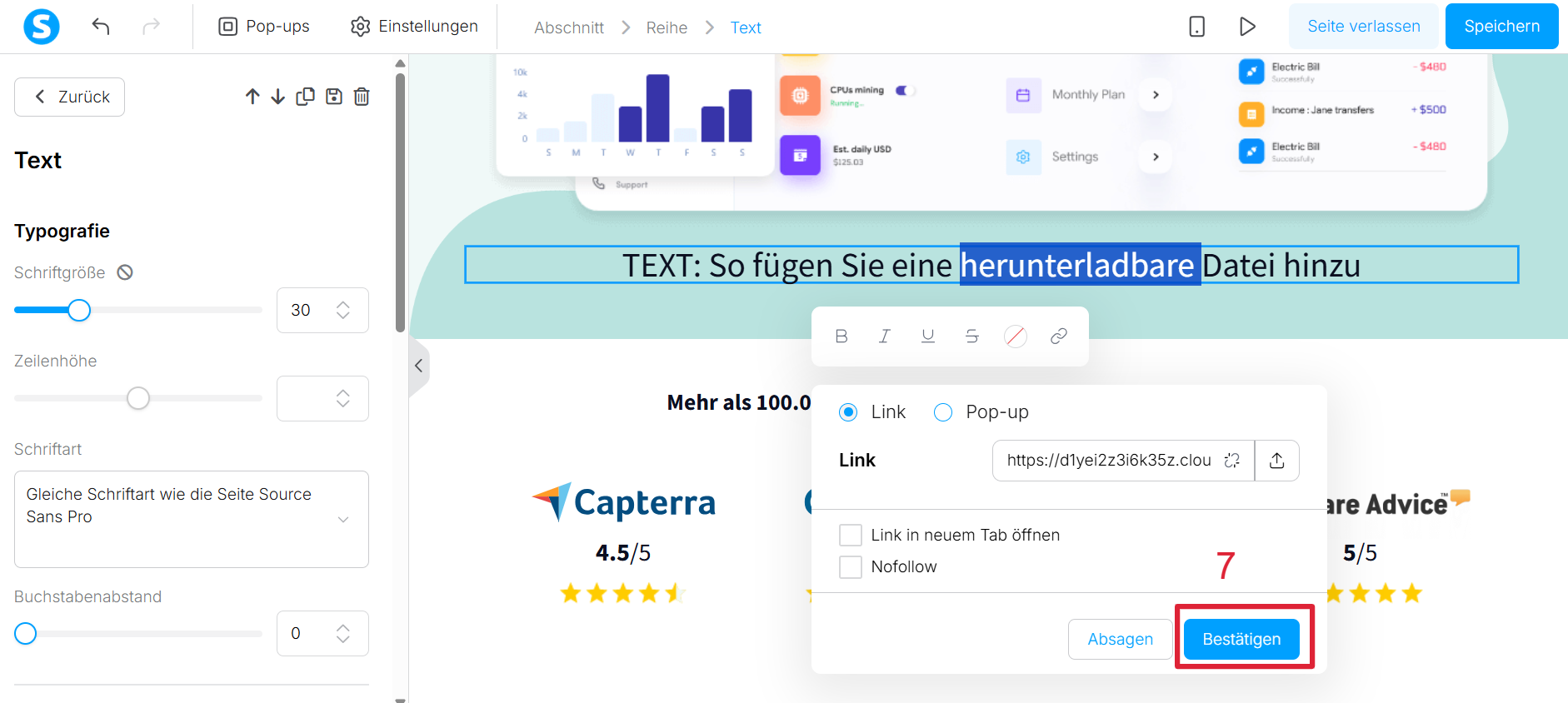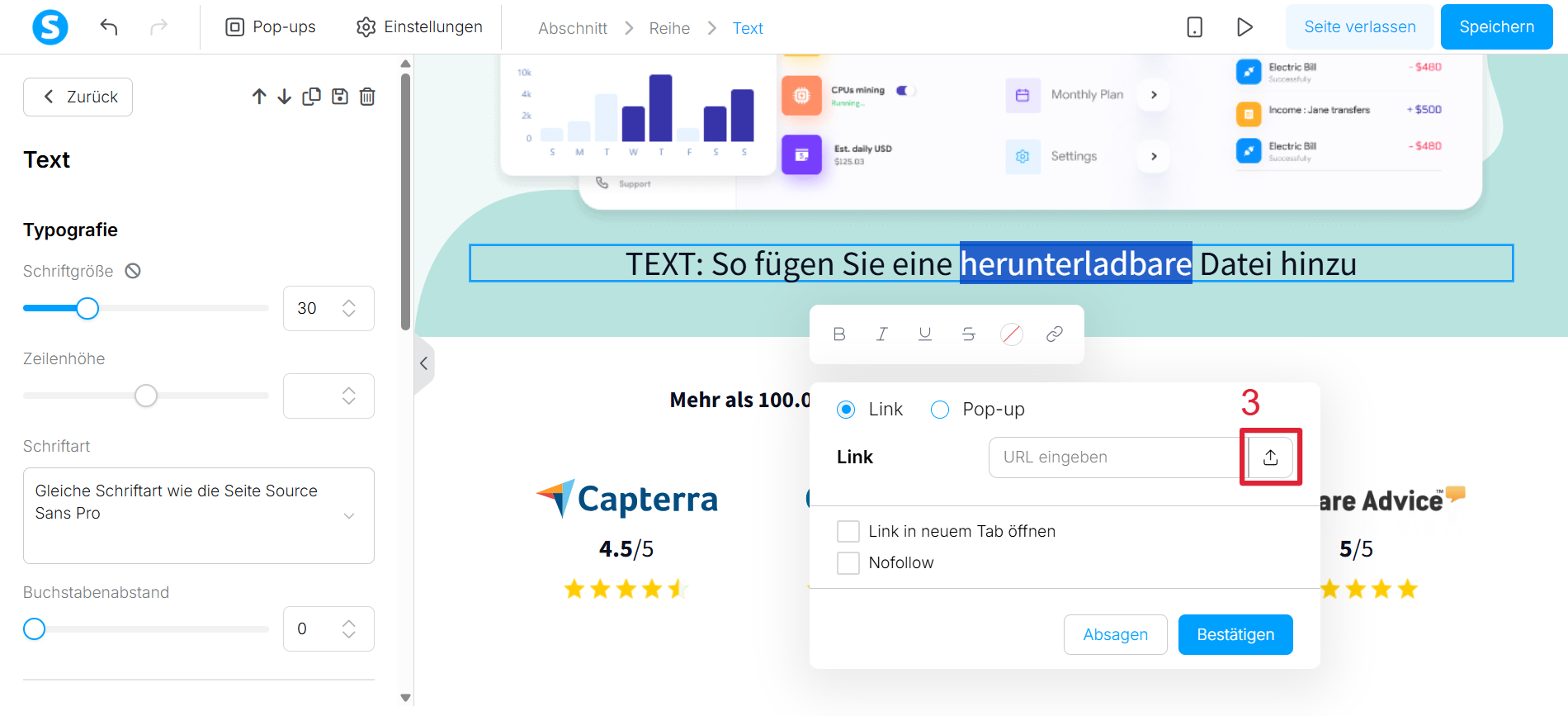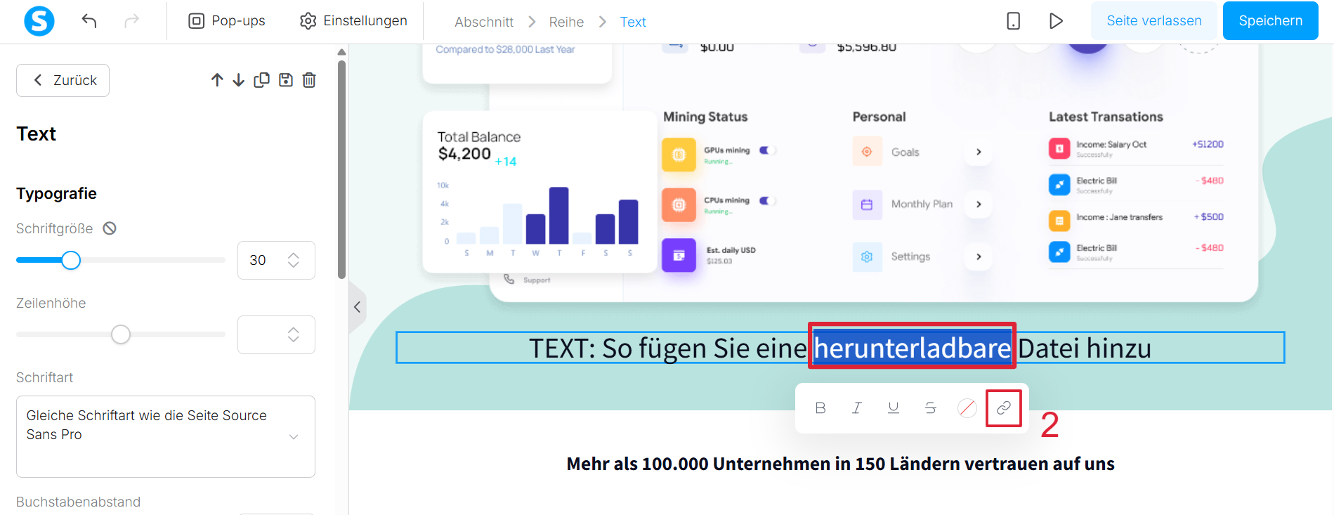 Wählen Sie den Text aus, bei dem Sie eine herunterladbare Datei hinzufügen möchten, und klicken Sie auf das Link-Symbol (2).