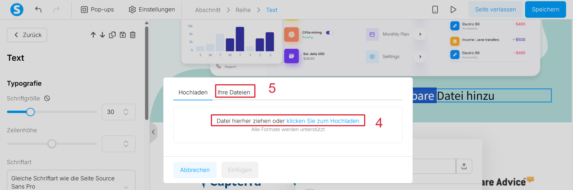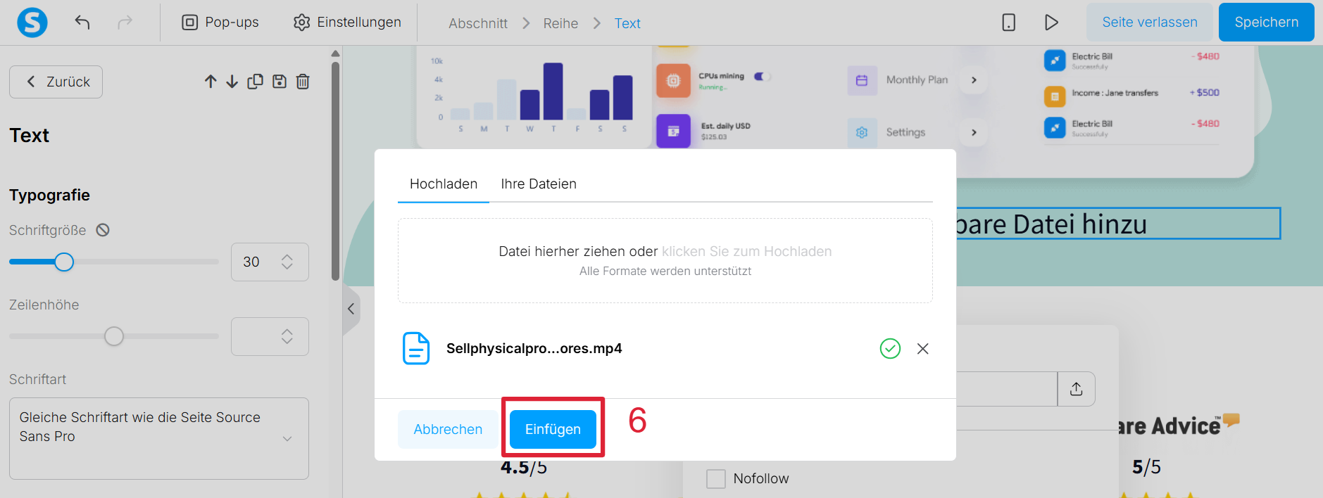 Nachdem die Datei hochgeladen wurde, wählen Sie sie im Dateibrowser aus und klicken Sie auf die Einfügen-Schaltfläche (6).