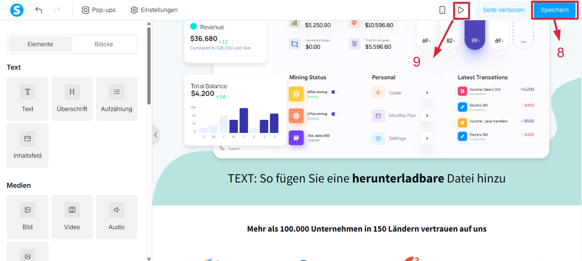 Um zu überprüfen, ob die Datei korrekt heruntergeladen wird, klicken Sie zuerst oben im Editor auf Speichern (8) und anschließend auf Vorschau (9).