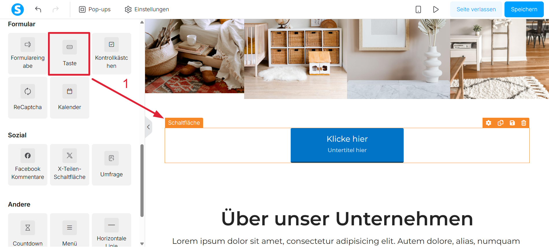 Ziehen Sie im Seiten-Editor das „Schaltflächen (Taste)“-Element aus dem Panel auf der linken Seite und legen Sie es auf der Seite ab (1).