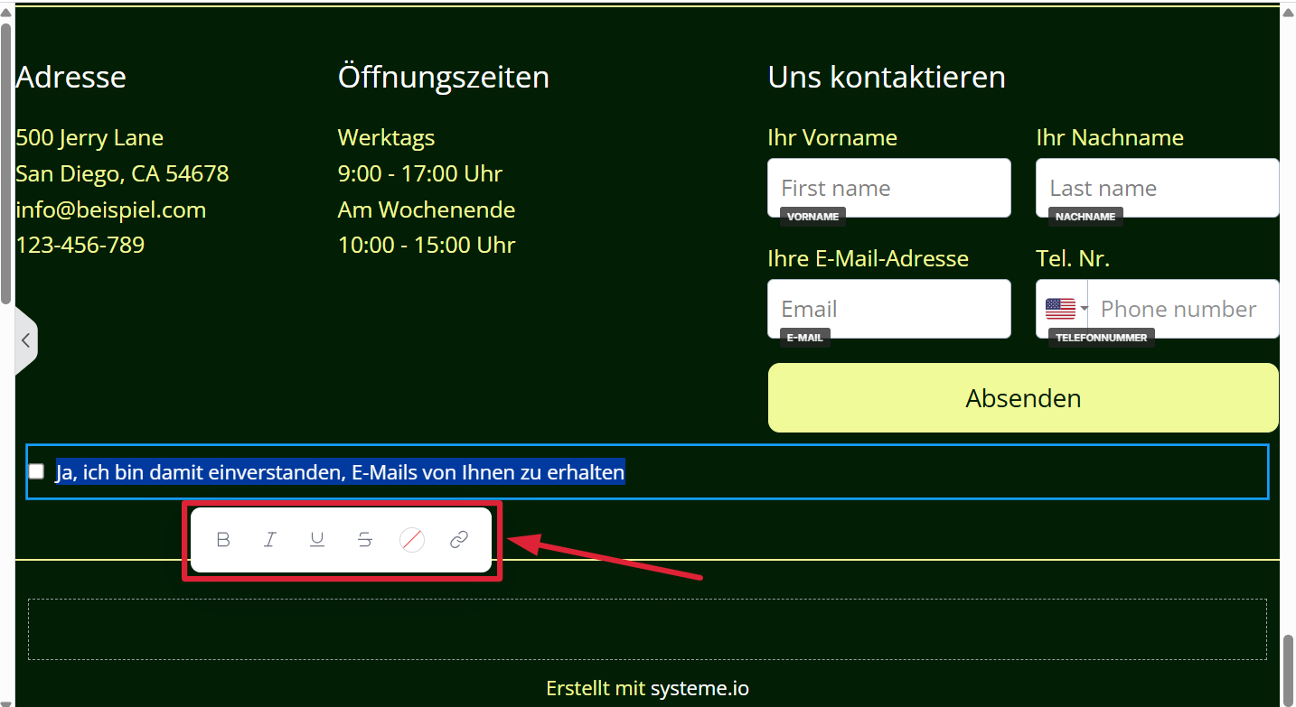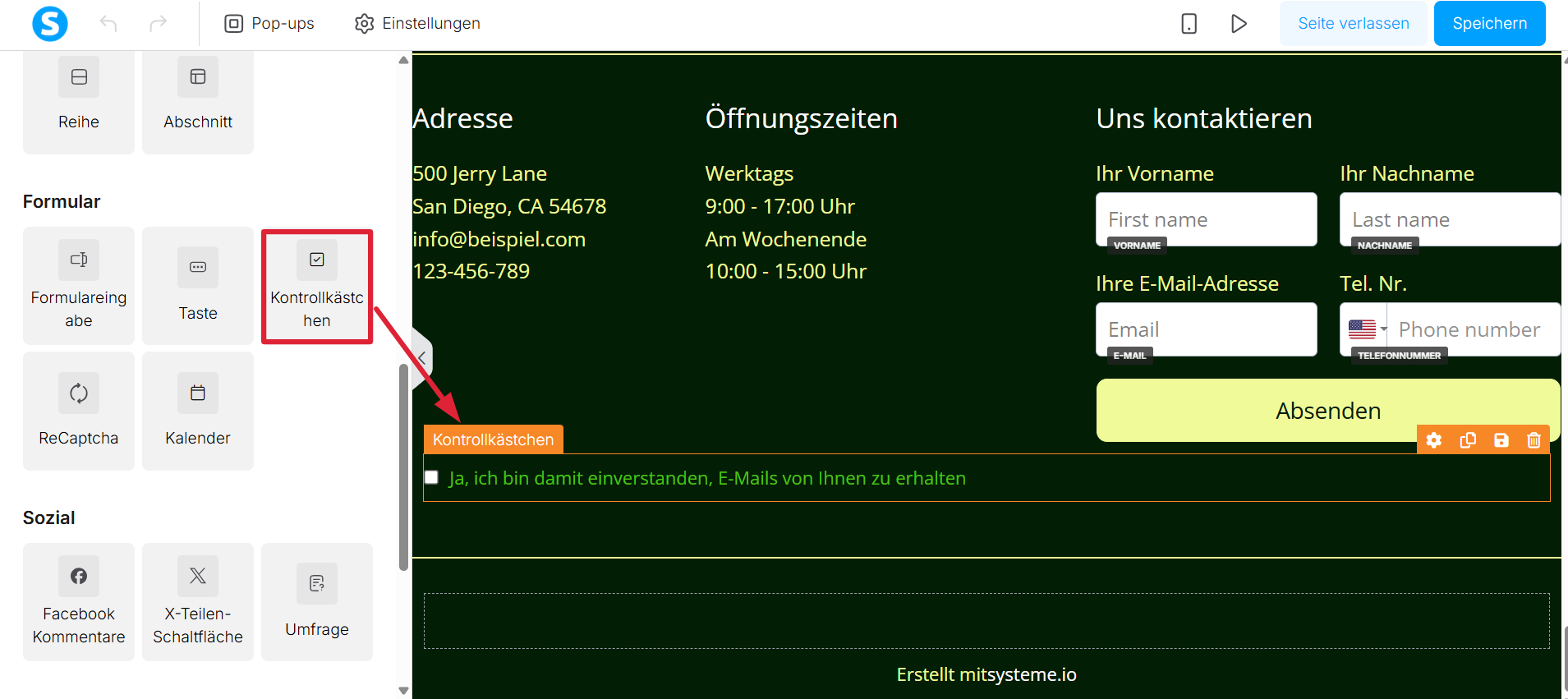 Ziehen Sie im Seiten-Editor das Element „Kontrollkästchen“ aus dem linken Bedienfeld und legen Sie es auf Ihrer Seite ab.