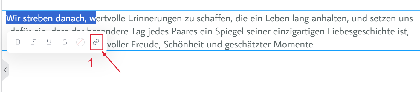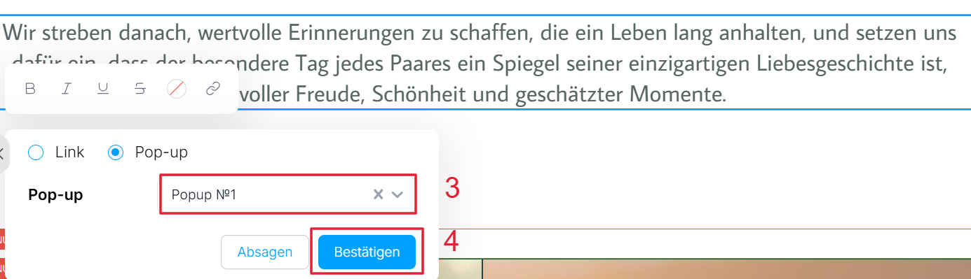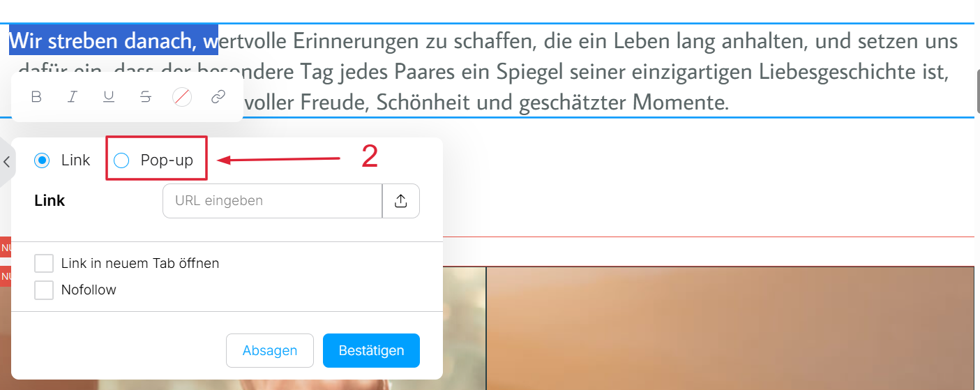 Wählen Sie den Text aus, auf dem das Pop-Up geöffnet werden soll, und klicken Sie dann auf das Ketten-Symbol (1).