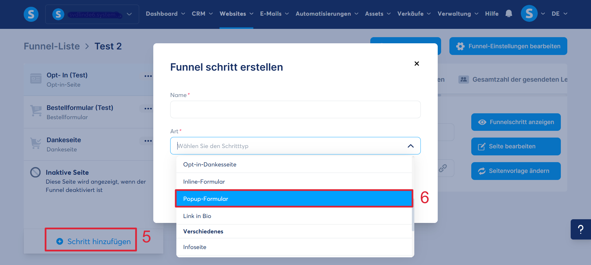 Schritt 1: Erstellen Sie ein Kontaktformular als Pop-Up, indem Sie zu Ihrem Sales Funnel gehen und eine neue Seite hinzufügen, indem Sie auf „Schritt hinzufügen“ klicken (5).