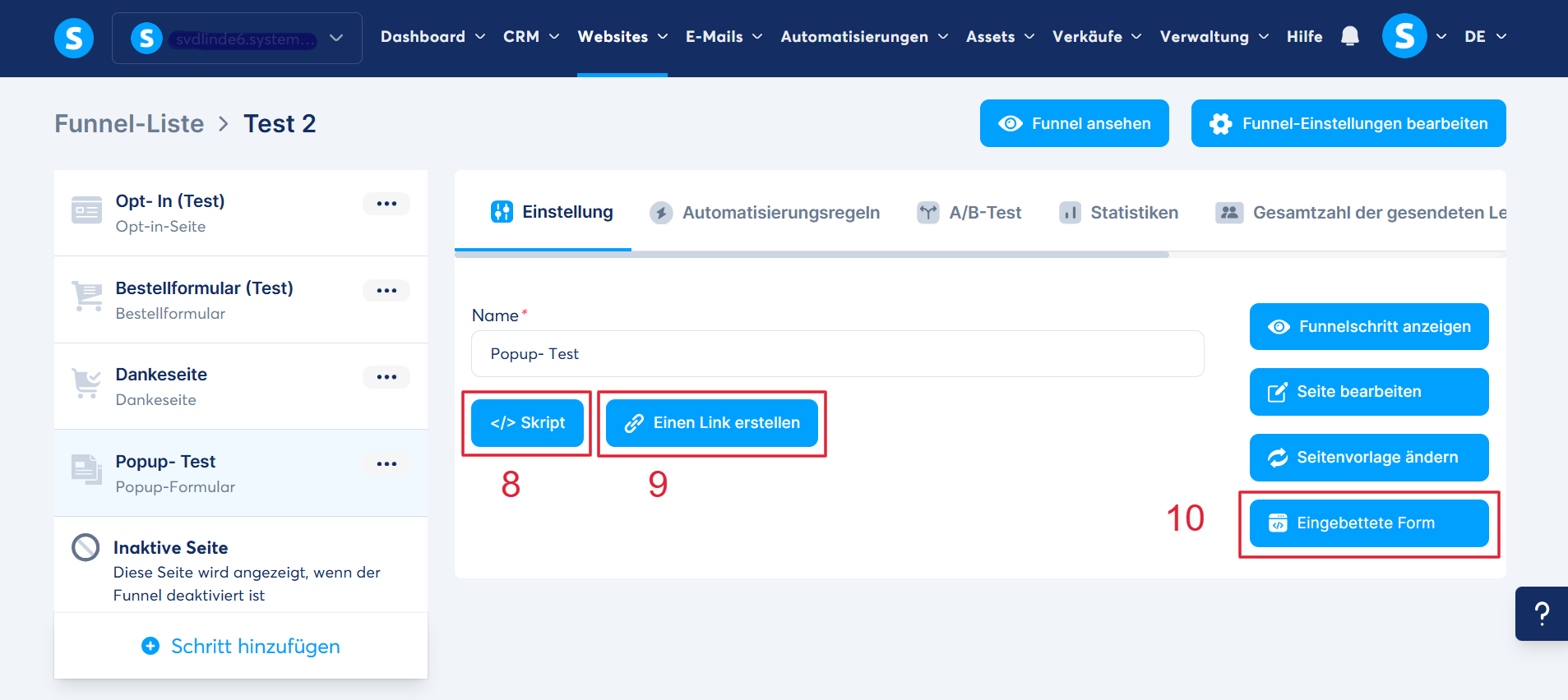 Das eingebettete Formular Ihres Pop-Ups kopieren, indem Sie auf die „Eingebettetes Formular“-Schaltfläche klicken (10).