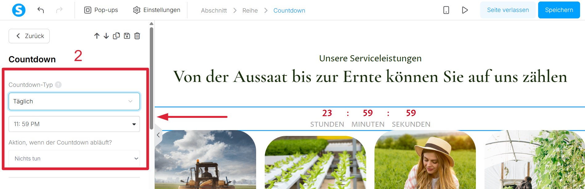 Ziehen Sie im Seiteneditor das „Countdown“-Element aus dem linken Panel und legen Sie es auf Ihrer Seite ab (1).