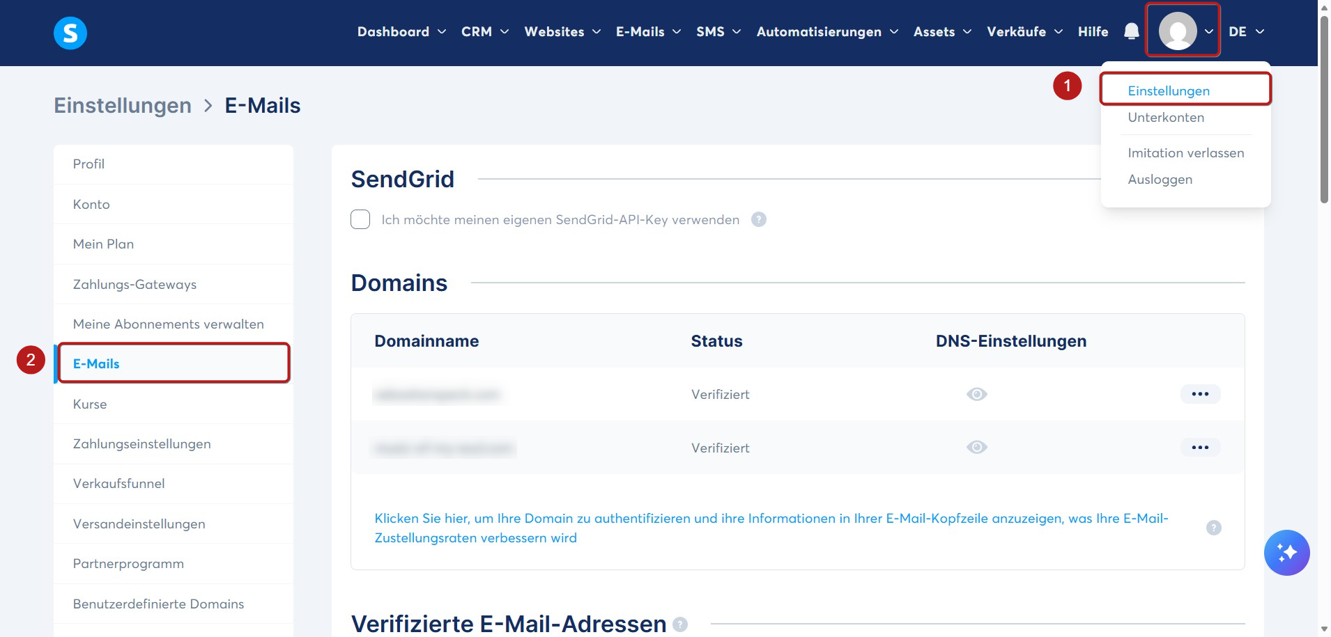 Um dies einzurichten, klicken Sie auf Ihr Profilbild und wählen Sie Einstellungen (1). Klicken Sie dann auf E-Mails (2).