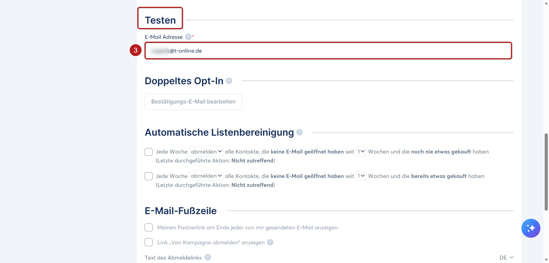 Scrollen Sie nach unten zum Abschnitt Testen und geben Sie die E-Mail-Adresse ein, an die Sie Ihre Test-E-Mails senden möchten (3).
