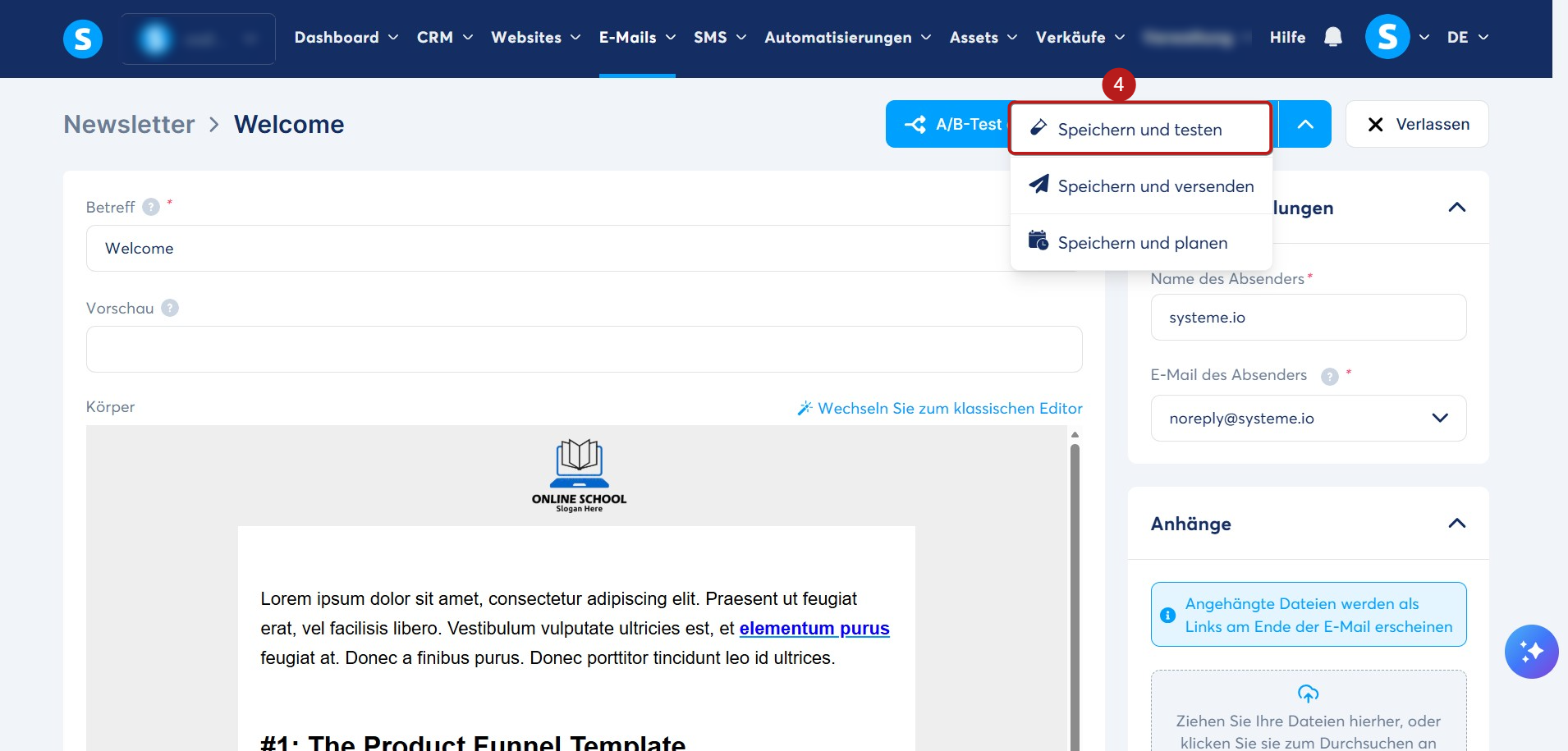 Öffnen Sie den Newsletter und klicken Sie auf Speichern und testen (4).