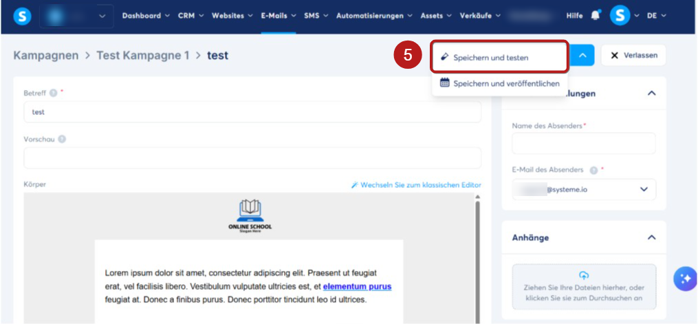 Klicken Sie in Ihrer Kampagnen-E-Mail auf Speichern und testen (5).