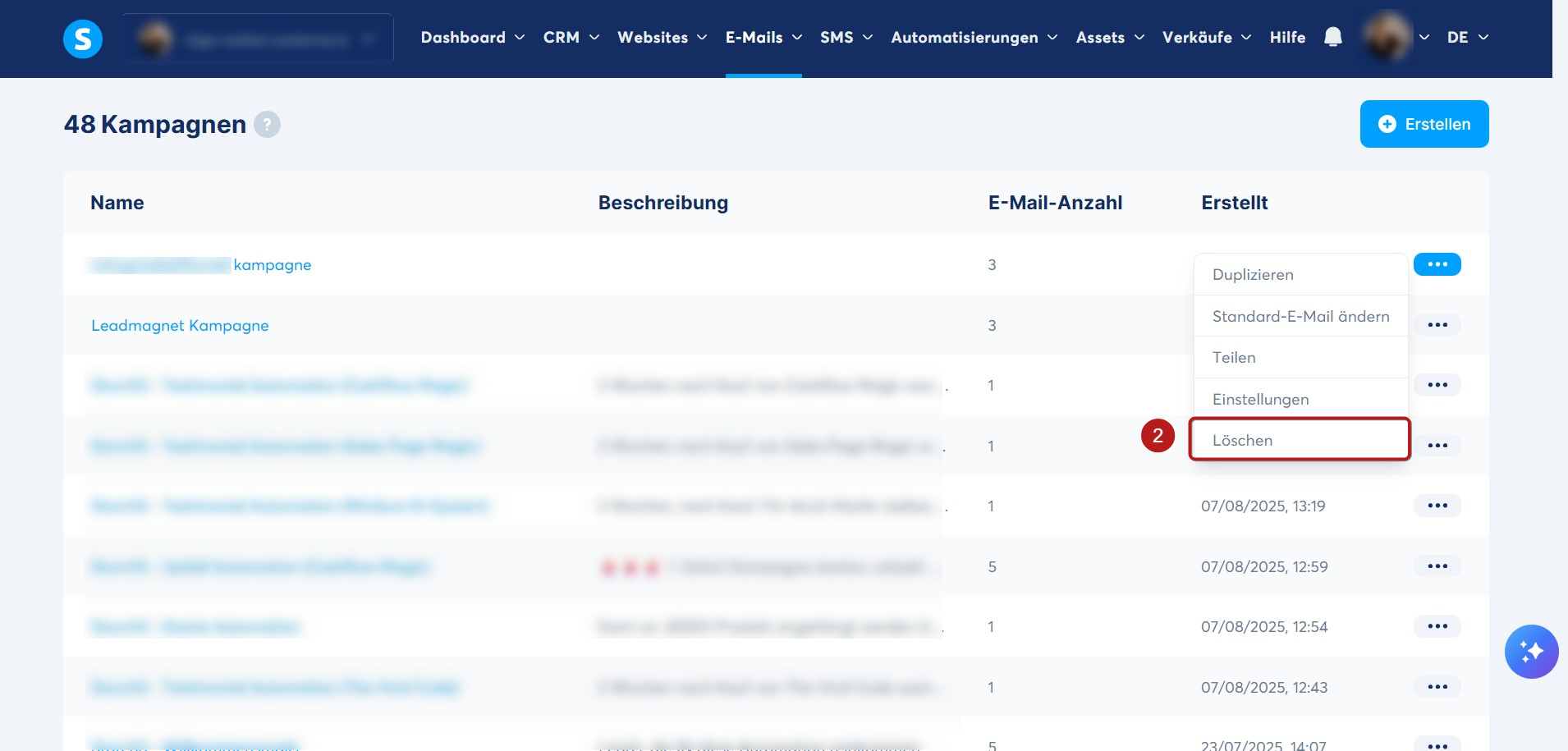 Suchen Sie die Kampagne, die Sie löschen möchten, klicken Sie auf das Drei-Punkte-Menü (...) und wählen Sie anschließend Löschen (2).