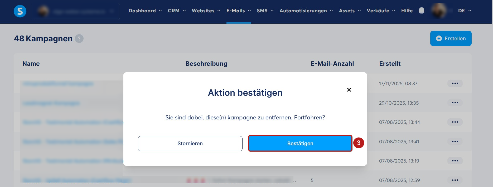 Klicken Sie im Popup-Fenster auf Bestätigen, um die Kampagne dauerhaft zu löschen (3).