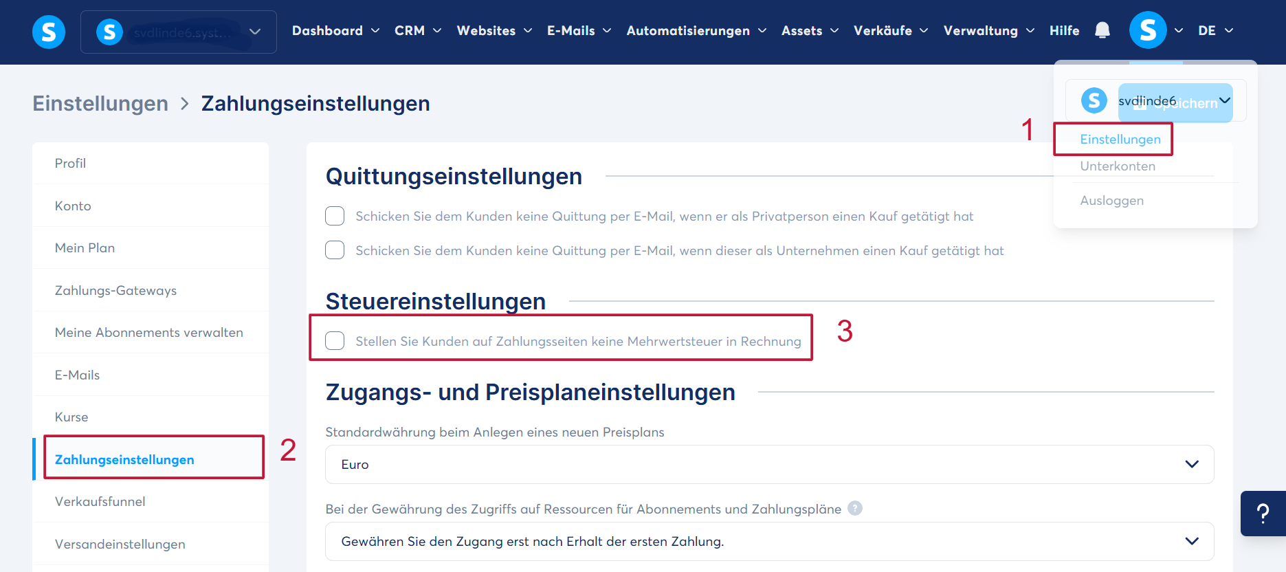 Gehen Sie zum Menü und klicken Sie auf Ihr Profilbild. Klicken Sie auf „Einstellungen“ (1) und dann auf „Zahlungseinstellungen“ ( 2). Deaktivieren Sie die Option „Stellen Sie Kunden auf Zahlungsseiten keine Mehrwertsteuer in Rechnung“ (3).