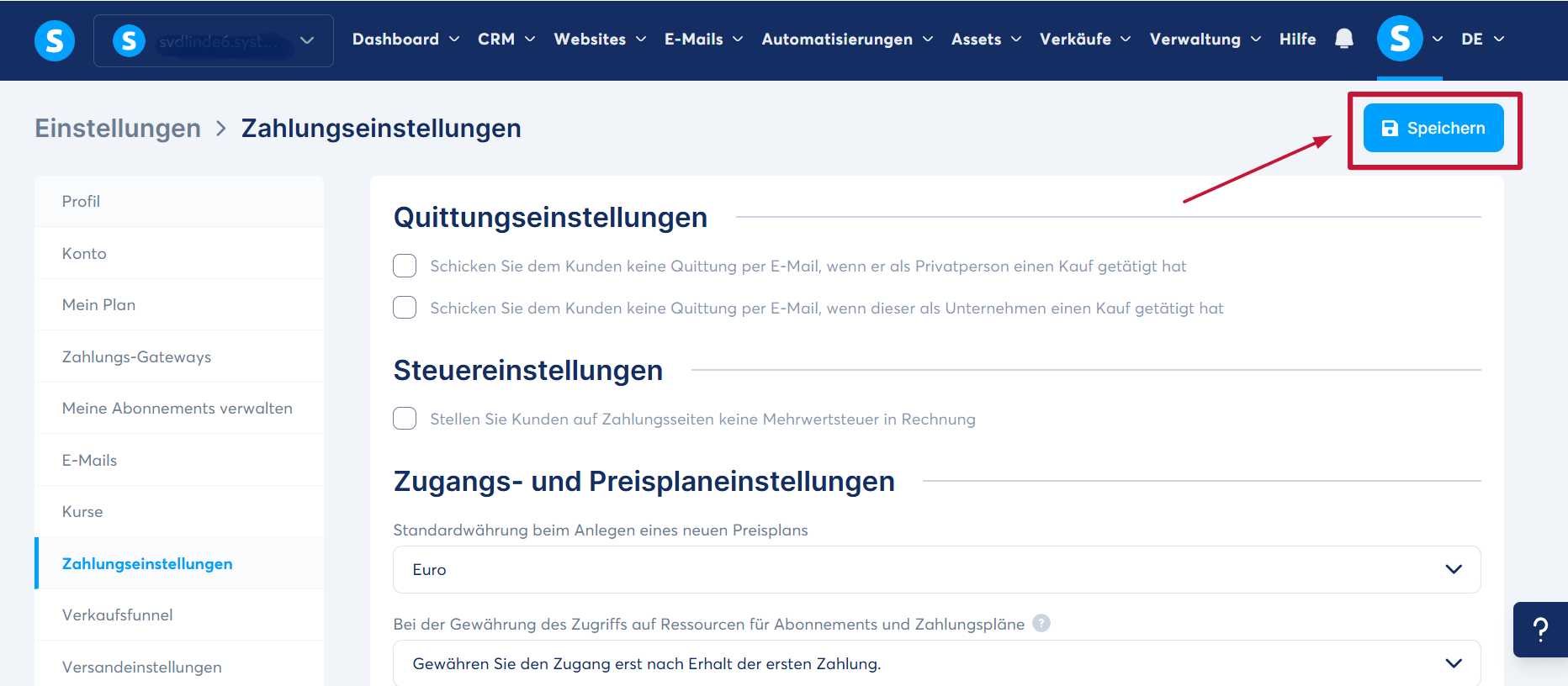Klicken Sie oben rechts in den Zahlungseinstellungen auf „Speichern“, um die Änderungen zu sichern.