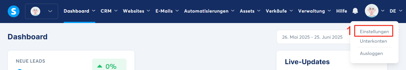 Klicken Sie auf Ihr "Profilbild" und dann auf den Abschnitt "Einstellungen" (Nummer 1 im Bild).