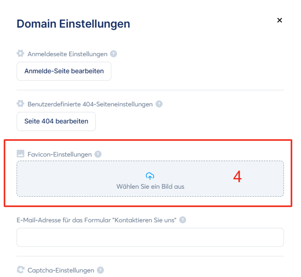Ein Popup-Fenster erscheint, in dem Sie auf die Schaltfläche "Favicon-Einstellungen" klicken müssen, um die Datei hochzuladen (Nummer 4 im Bild).
