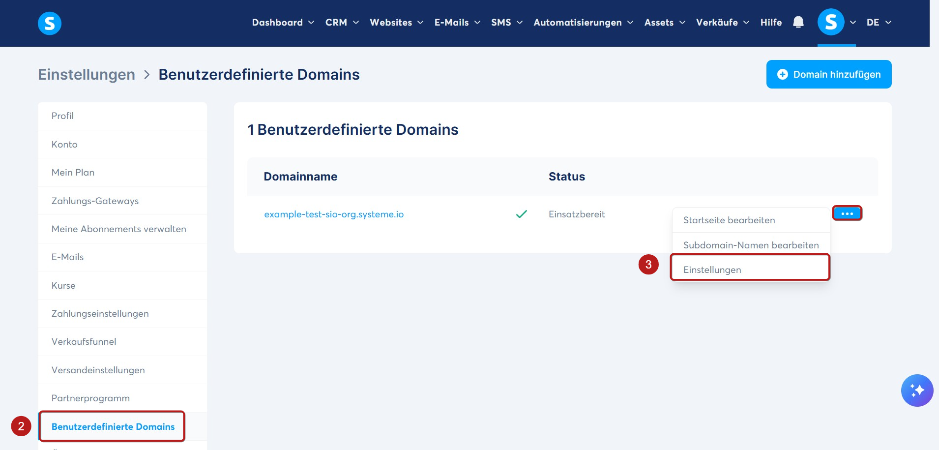 Klicken Sie auf Benutzerdefinierte Domains (2). Suchen Sie die Domain, die Sie aktualisieren möchten, klicken Sie auf das Drei-Punkte-Symbol und wählen Sie Einstellungen (3).