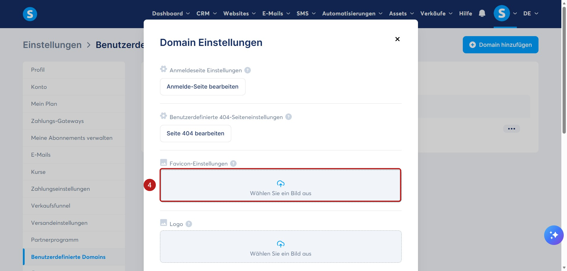Klicken Sie im Popup-Fenster auf Favicon-Einstellungen (4), um Ihr Bild auszuwählen.