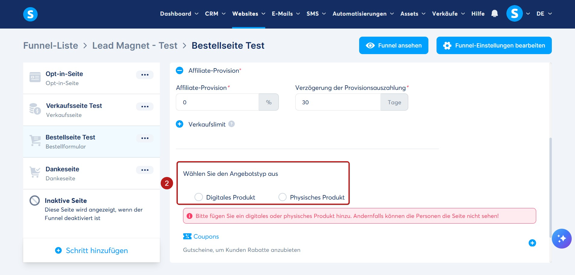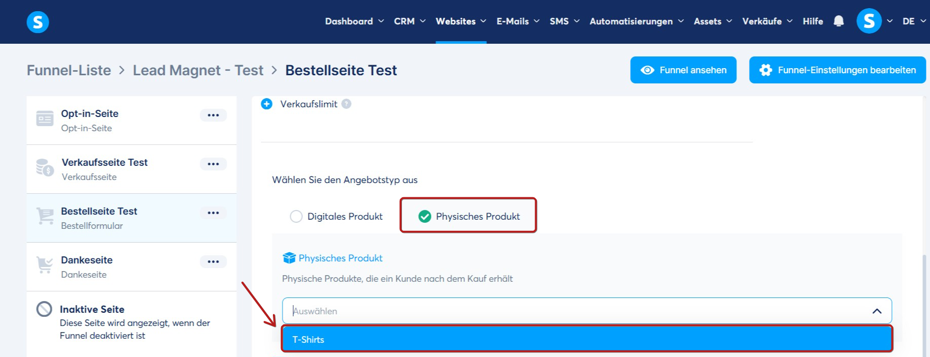 Hinweis: Für die Lieferung eines physischen Produkts müssen Sie einen externen Dienstleister wählen, da dies nicht über systeme.io möglich ist. Wenn Sie noch kein physisches Produkt erstellt haben, finden Sie hier die Anleitung.